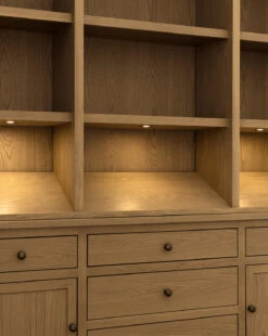 Inspired by classic built-in casework, our Adler Oak Cabinet beautifully combines traditional detailing with a modern, updated silhouette. It features ample storage space and integrated lighting that illuminates the angled shelf, elevating any space with its ambiance and functionality. With a heritage oak finish, it brings warmth and timeless charm to your home styling.