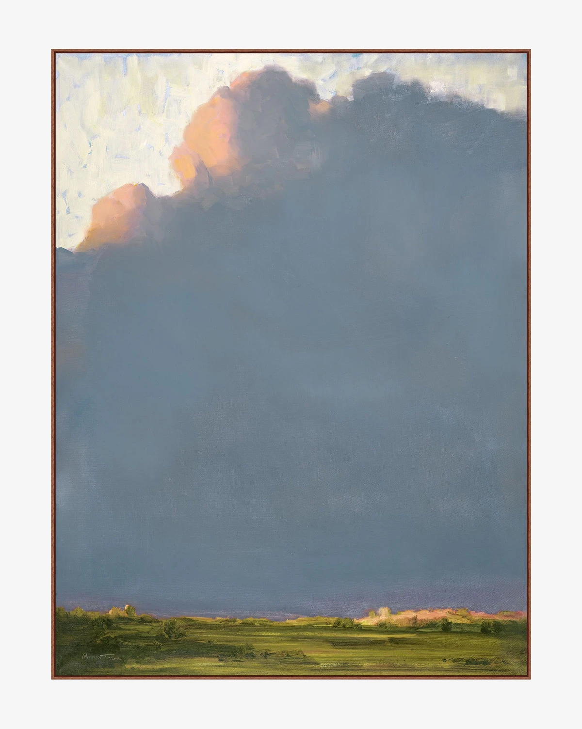 A serene landscape, All the Blue Above uses warmth and detailed brushwork to tell its story. A walnut wood floater frame allows for versatile styling in your home, elevating wall treatments or dresser vignettes.