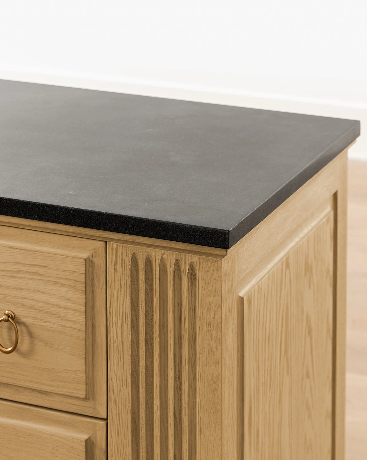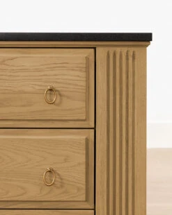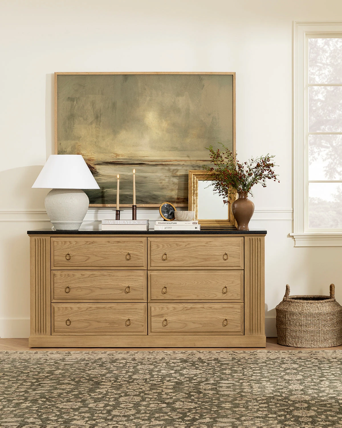 Featuring our exclusive Drift Oak finish and honed granite top, we designed the Ambrose Dresser to bring a vintage yet organic feel to your bedroom styling. The dresser is adorned with solid brass drop pulls, vertical fluting, and wire brushed for a textural look and hand feel. With six soft close drawers, the dresser is a functional addition to your space.Â