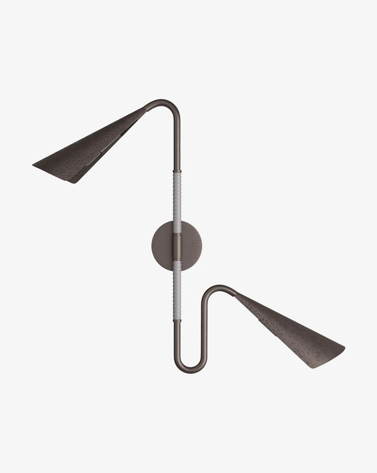 The Amerson Sconce is contemporary and versatile, sending light in two distinct directions with its dual shades. The striking form is an ideal addition to your styling with its expertly mixed materials of English bronze steel and graphite leather.