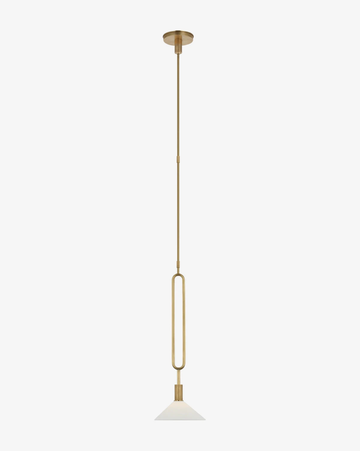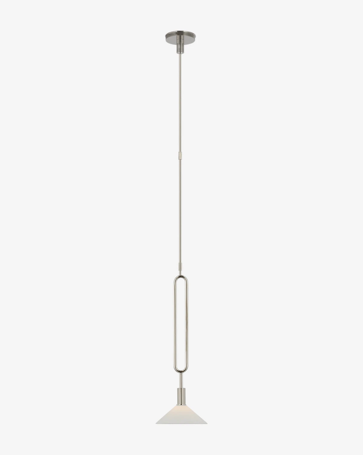 The Argo Pendant strikes a balance between its sleek structure and its stunning tapered shade. The matte porcelain shade brings contrast to the dark metal shapely rod, making a unique statement in lighting designs from the kitchen to the living room.