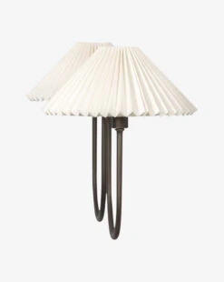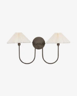 French-inspired, the Ashby Double Sconce brings a classic warmth and traditional charm to your home lighting. Two curved light oil-rubbed bronze arms extend from an iron backplate, creating an elegant silhouette that pairs beautifully with the cream-toned pleated linen shades. It brings a refined sense of coziness wherever it is styled.Â