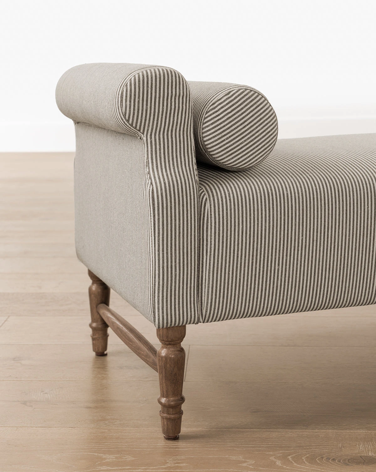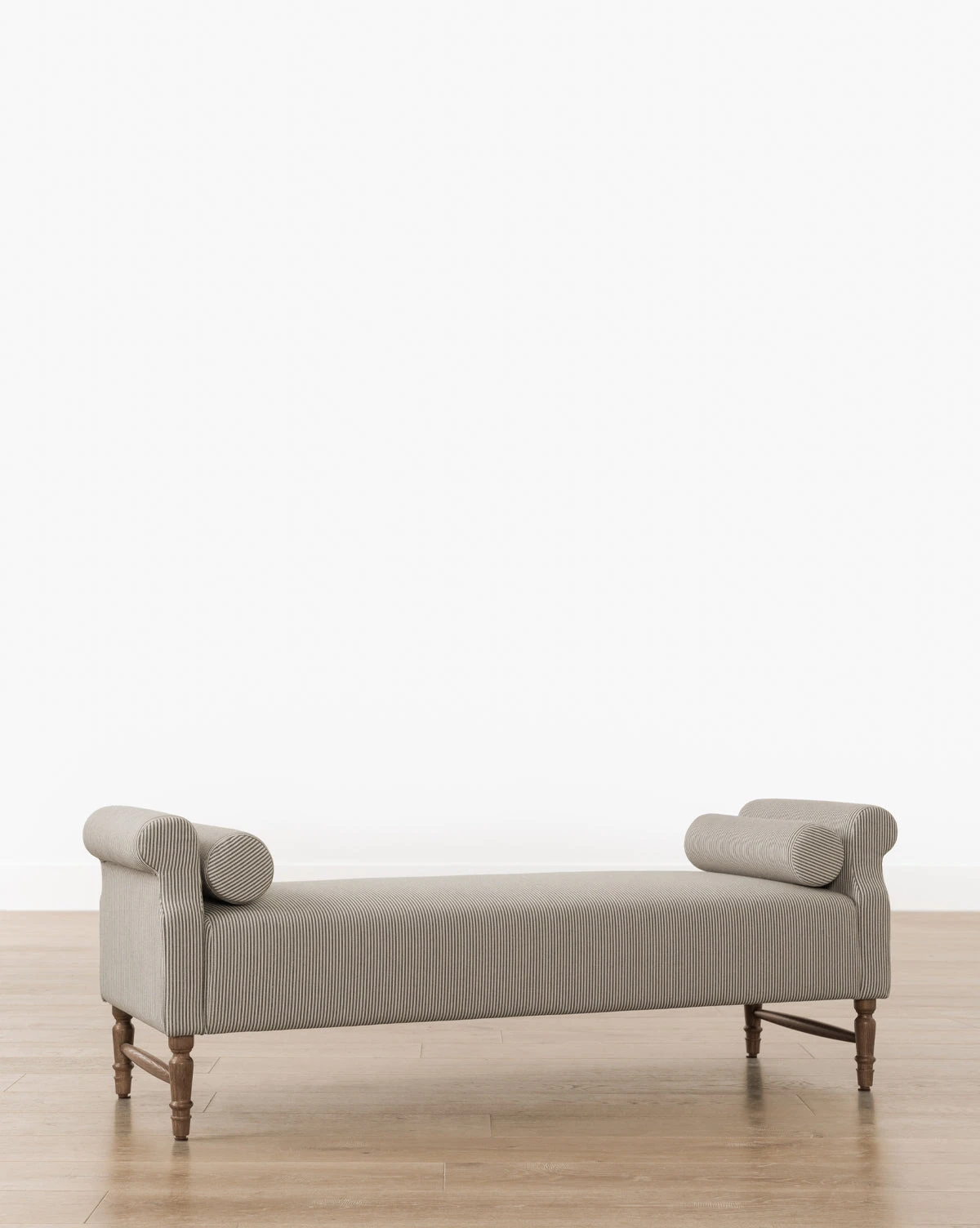 An updated take on a classic design, the Asher Bench welcomes rest while seamlessly lending a playful feel to the home with its pair of bolster pillows. A wide, welcoming seat cushion rests on an elegantly crafted base and is available in either a charcoal & ivory striped linen or a fawn cotton velvet.