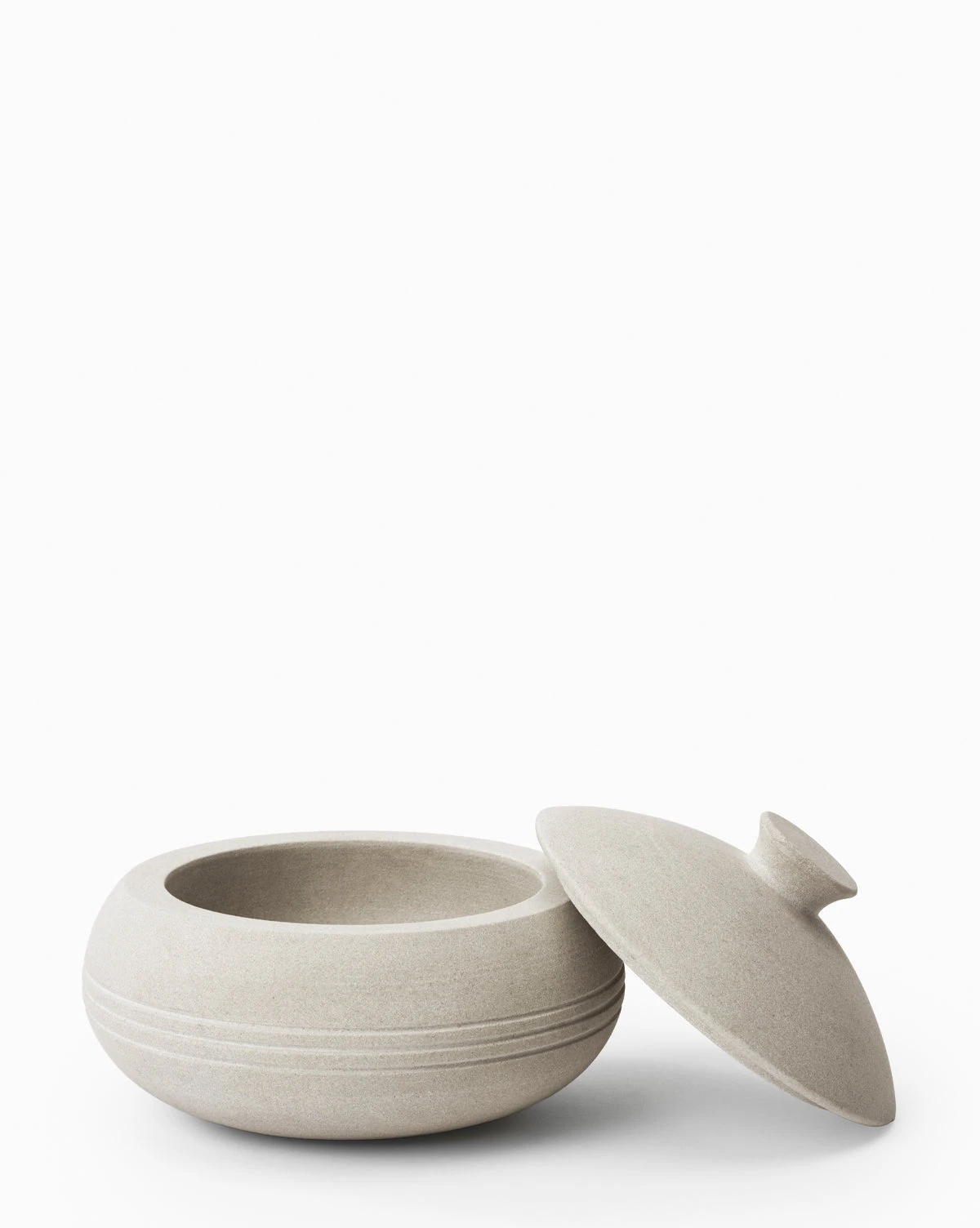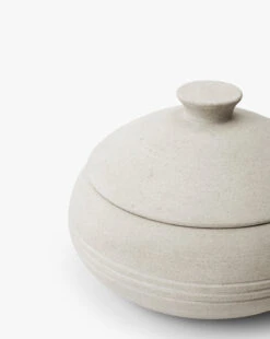Made from mint sandstone and organic in shape, the Aston Stone Box seamlessly elevates existing decor with its artisanal character. The sculptured lid and subtle line detailing make a statement, while the neutral tone of the rounded stoneware box supports its versatility. Styled on a console or shelf, it brings a sense of refinement and tranquility to any room.Â