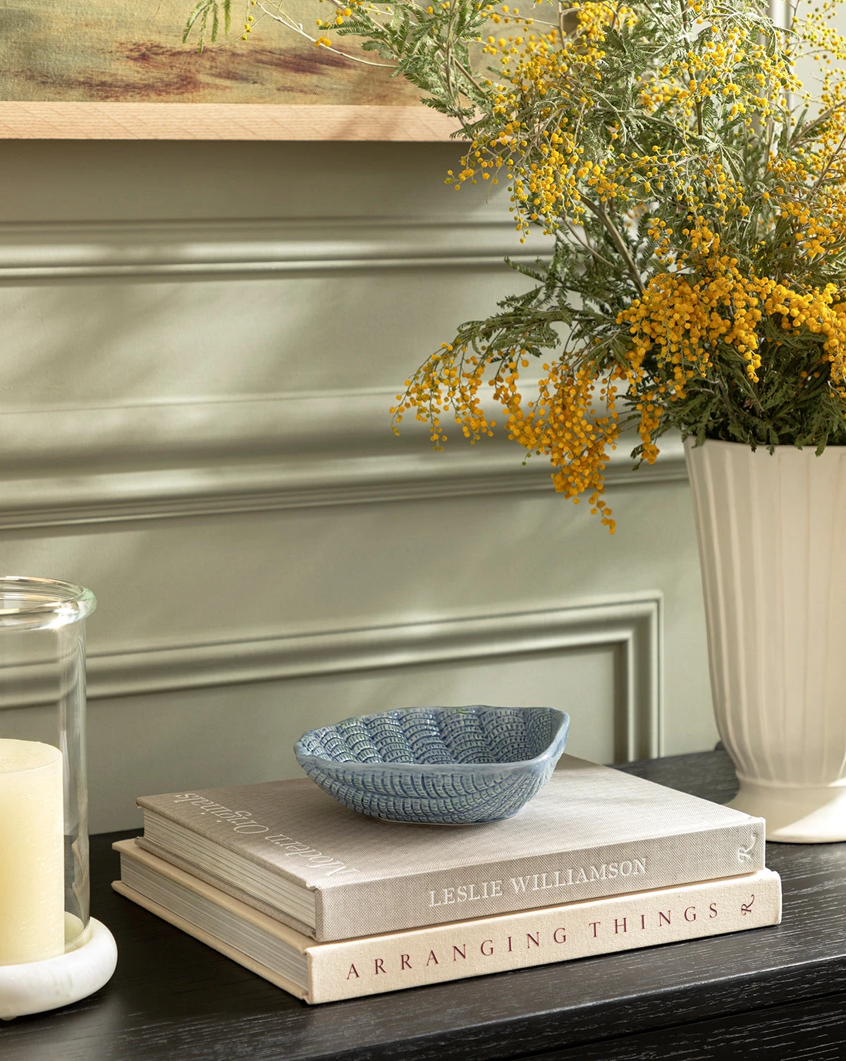 The Aurelie Shell Shaped Bowls showcase organic curves and delicate detailing in beige, blue, cream, and pink stoneware. Their sculptural form adds an elegant, coastal-inspired touch to any table or open shelving.