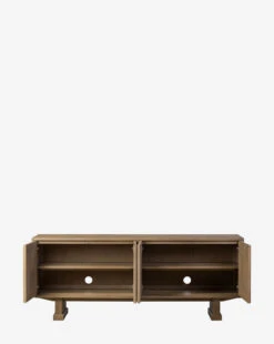 A modern take on Deco-inspired design, the Avalonia Oak Sideboard offers both style and function. Crafted from solid oak with a light, drifted finish, it features inverted chamfered framing and door molding for subtle dimension. Ski-style legs elevate the piece, making it a beautifully refined storage solution for dinnerware, linens, and more.