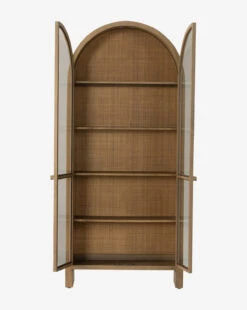 Crafted from solid mindi wood, the Badgley Cabinet is burnished to create a smooth, shiny finish. Glass-front cabinetry showcases the woven, natural cane backing inside, and fixed shelves allow for thoughtful, intentional styling. Designed in a beautiful arch shape extending all the way to the floor, its architectural shape is a distinctive addition to dining rooms and living spaces.
