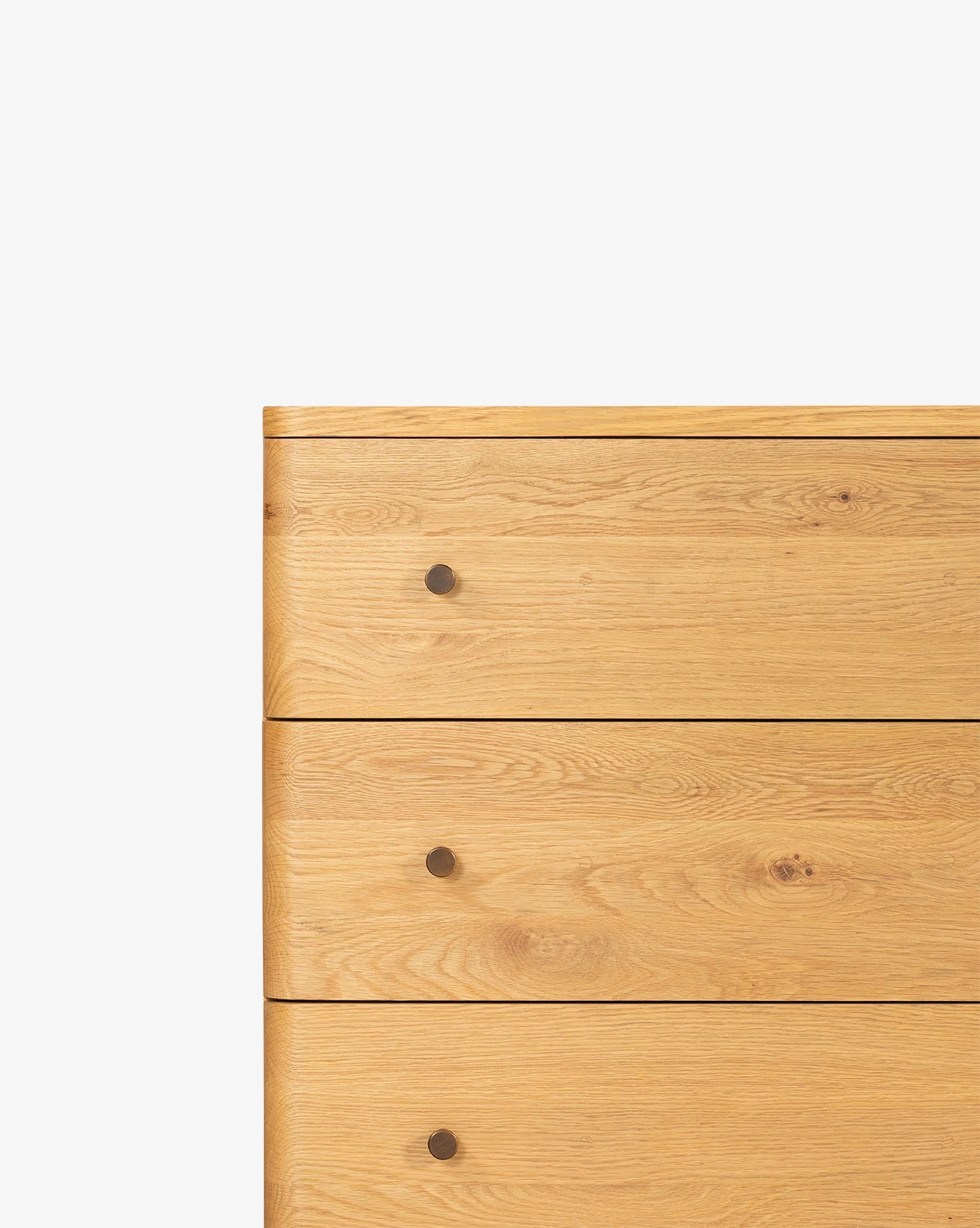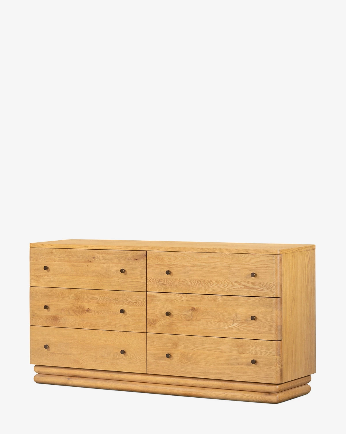 Featuring a contemporary stacked double-plinth tube base, the Bailey Dresser draws the eye with its creative design. Crafted from solid oak in a light finish, the dresser is approachable and sophisticated, showing off the organic details of the oak woodgrain.