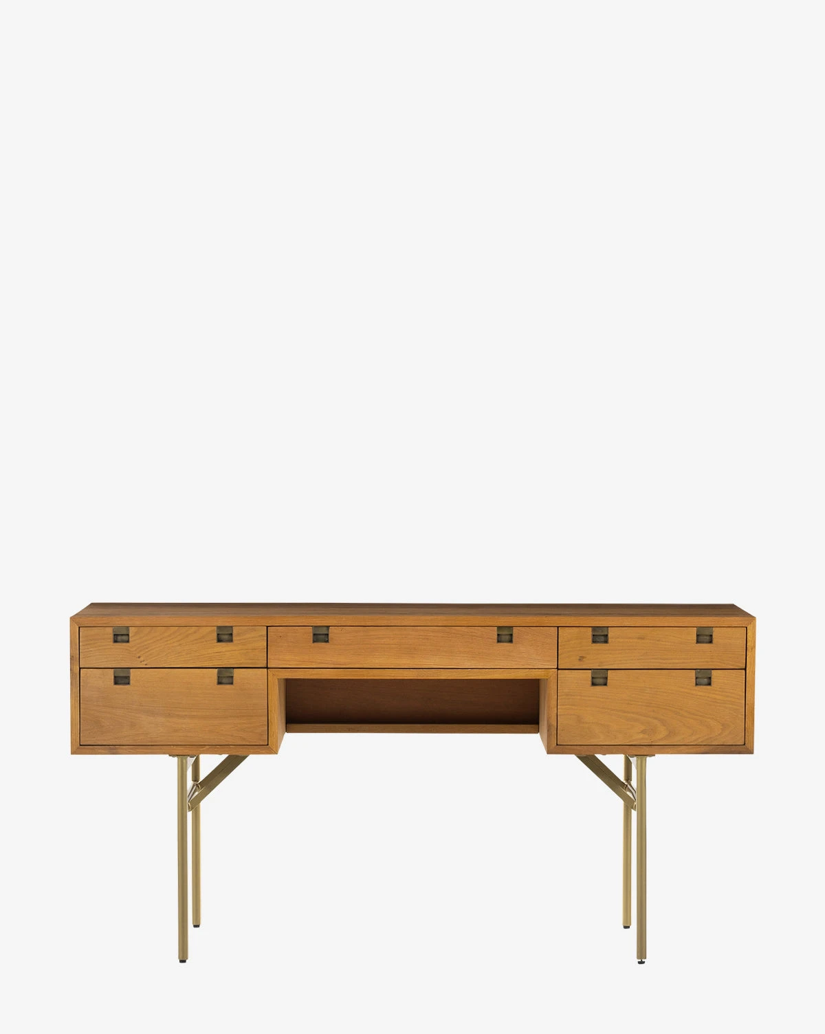 Giving both utility and style to your space, the Betsey Desk incorporates five functional drawers with squared hardware into its Danish-inspired design. The streamlined structure made with solid natural oak is supported by sleek iron legs finished in satin brass.