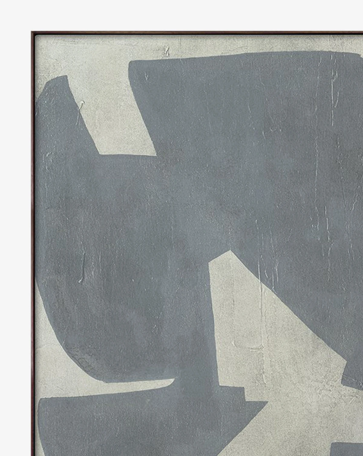 With muted tones of blue and light tan, Blue & White Abstract makes a statement wherever it is placed. With geometric elements that create visual contrast across its composition, to smooth curves that give this piece a calming appeal, this abstract piece brings a sophisticated modern element to your decor. Â