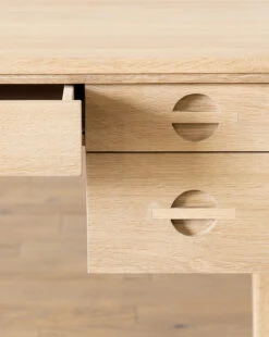 The Bodin Desk combines natural finishes with modern lines for streamlined desk space. With practical storage and simple design, this piece is approachable and functional. Its drawer handles blend into the piece, further highlighting the Bodin Desk’s emphasis on its natural oak construction.