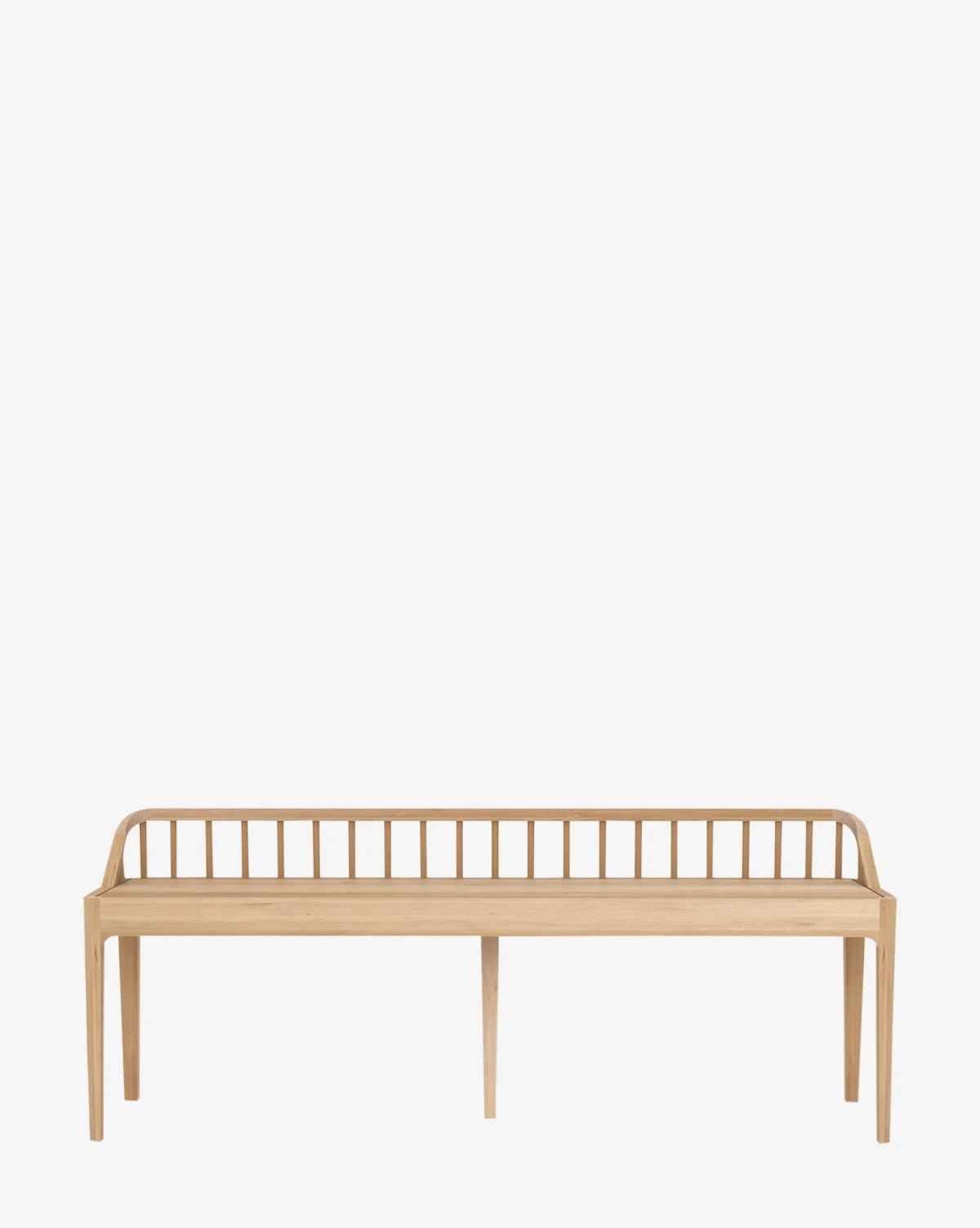 While drawing inspiration from the traditional spinning wheel, the Carli Bench makes a modern statement. Â Its low profile back incorporates perfectly aligned spokes and is entirely crafted of oak or walnut.Â