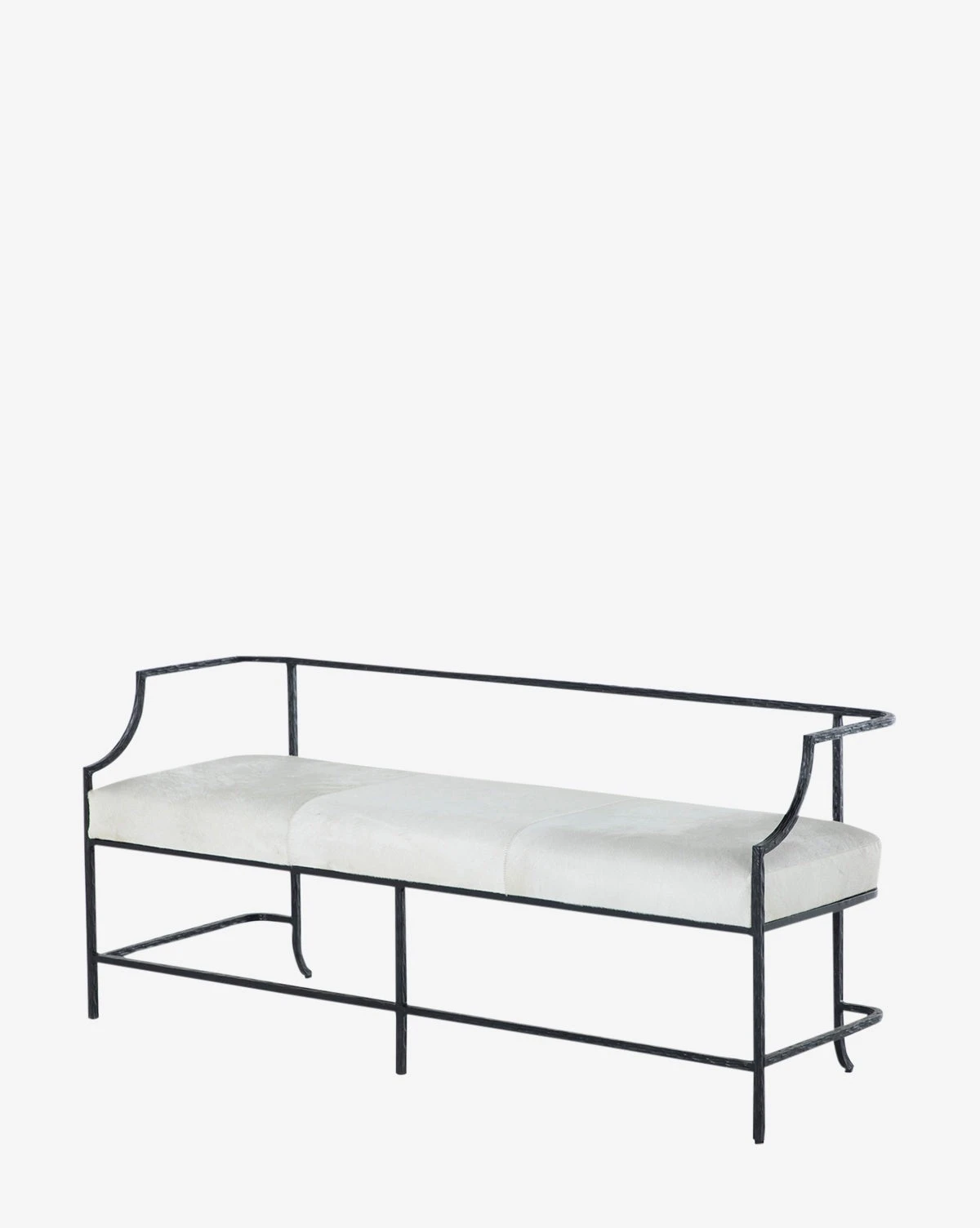 With a solid, flat black iron frame, the Carse Bench creates visual interest with its distinctive shape and lines. Featuring a fixed cushion of hair-on-hide leather in natural ivory, this piece is an upscale way to expand seating in entryways and beyond.