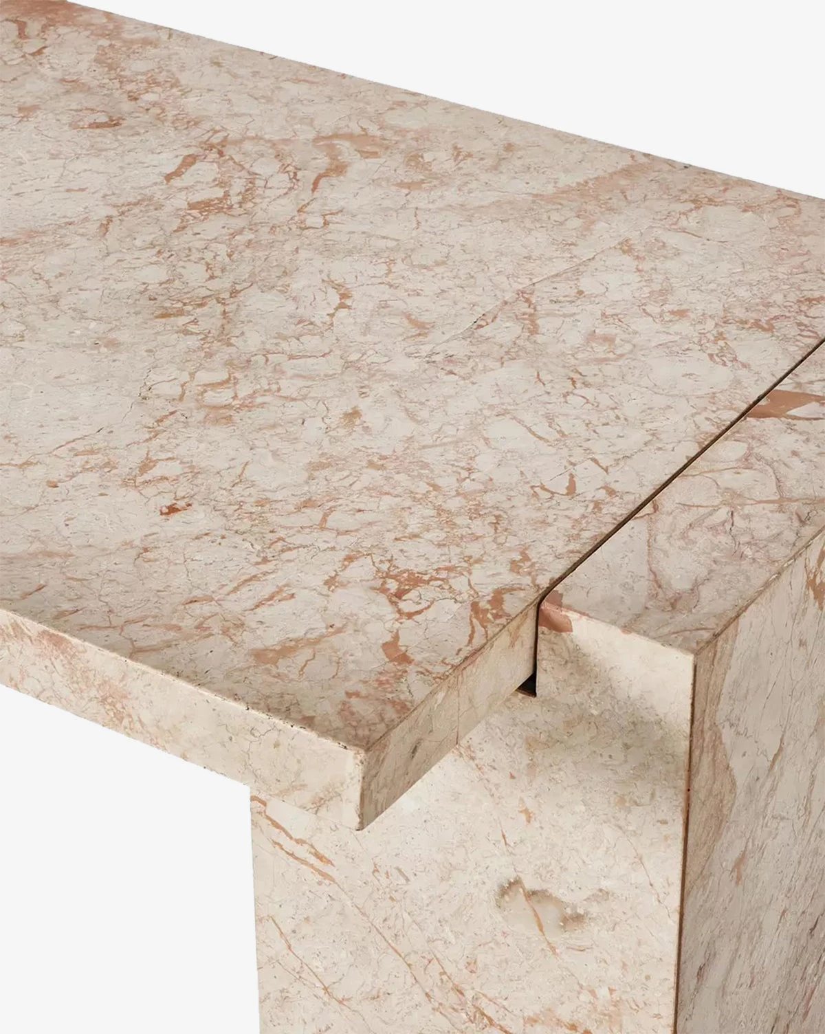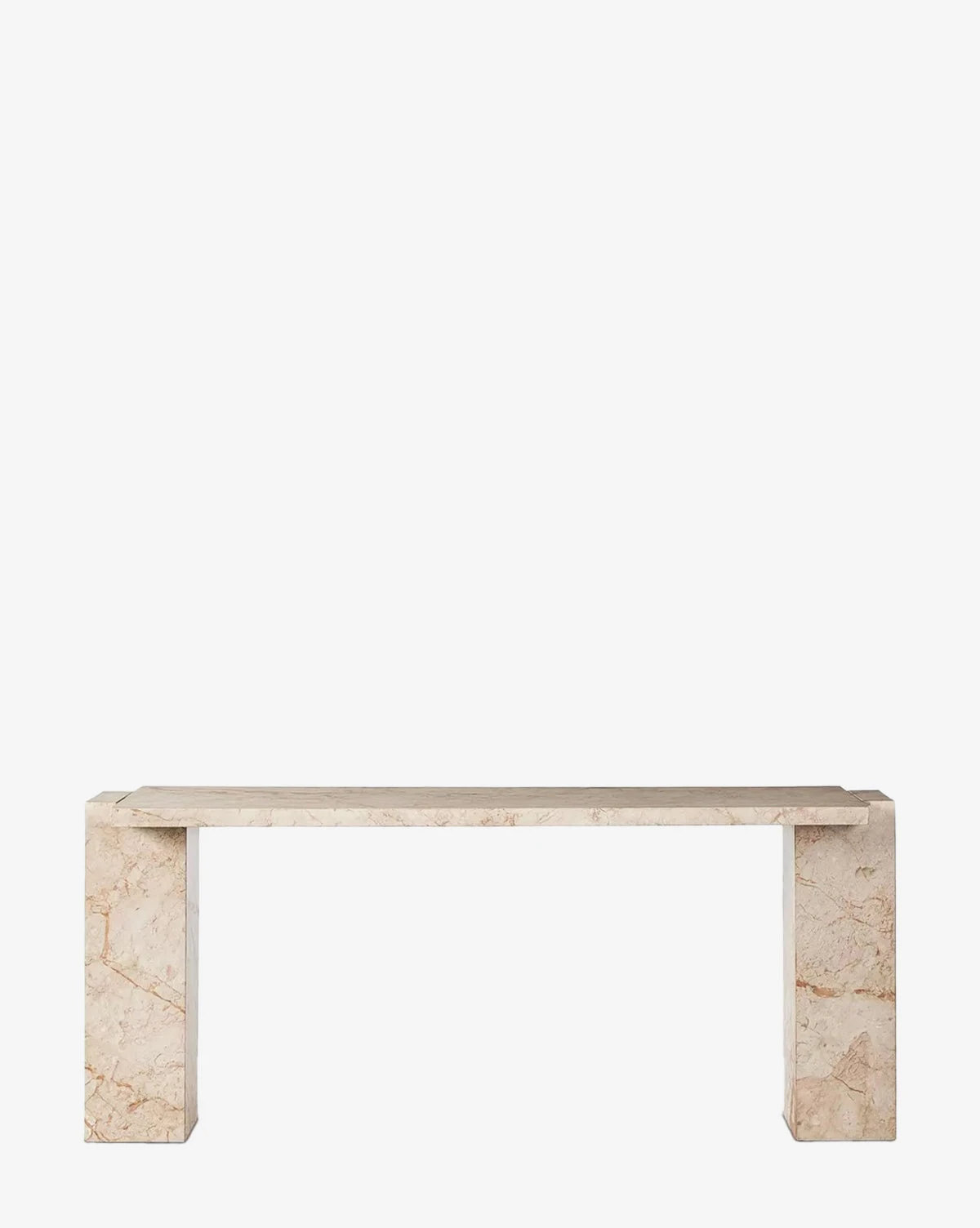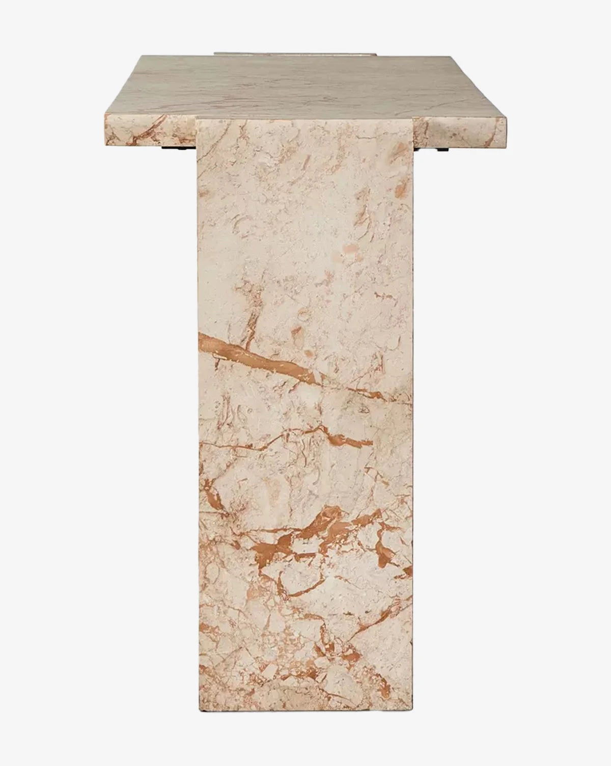 Sculptural and modern, the Cassara Console Table features desert taupe solid marble surfaces, blending unique form with natural detail. The marbling of the table lends organic visual interest to your space, while the geometric construction makes it a perfect piece for a distinct living room or entryway look.