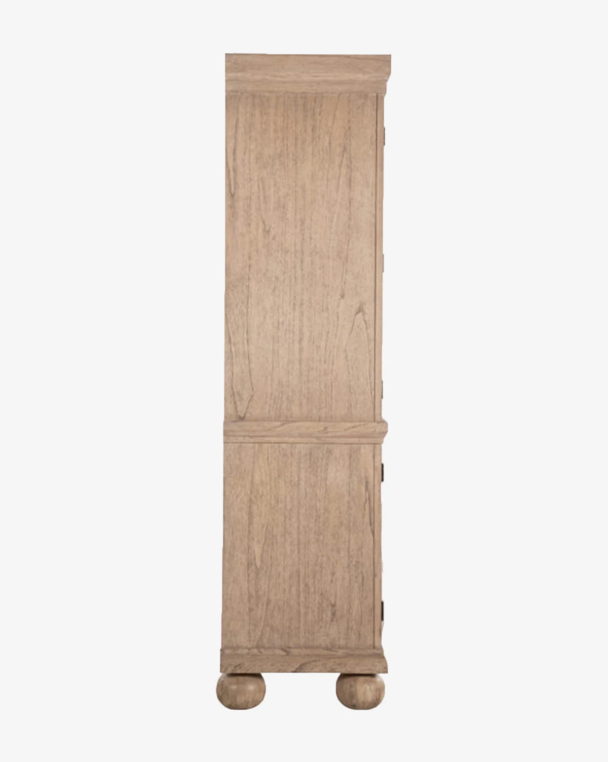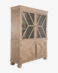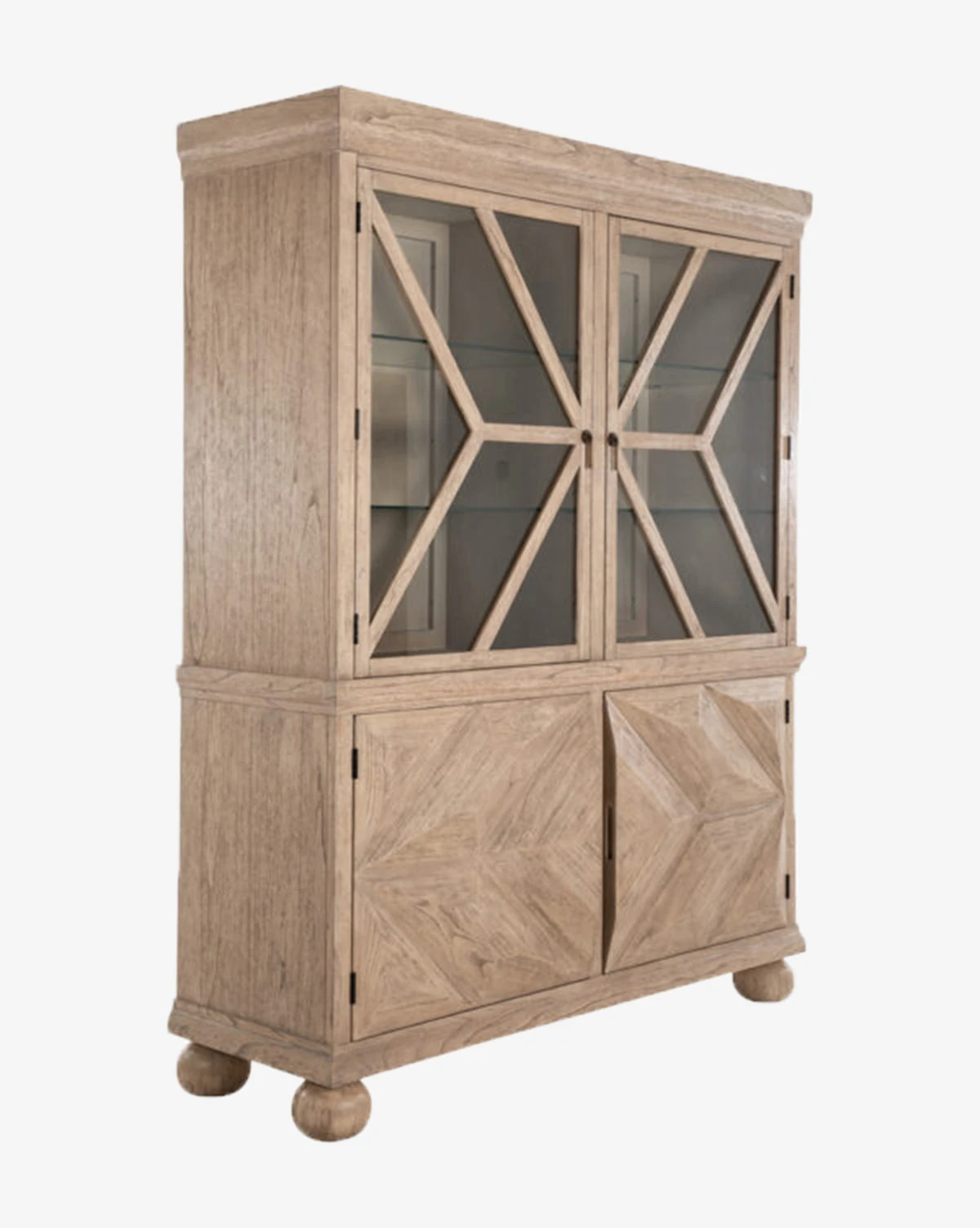 With geometric designs on the glass doors and lower wood doors, the Catherine Cabinet does both form and function elegantly. Its blonde natural finish on the solid wood construction gives the cabinet a sophisticated and organic feel, while its spaciousness allows for beautiful display and easy storage in your space.