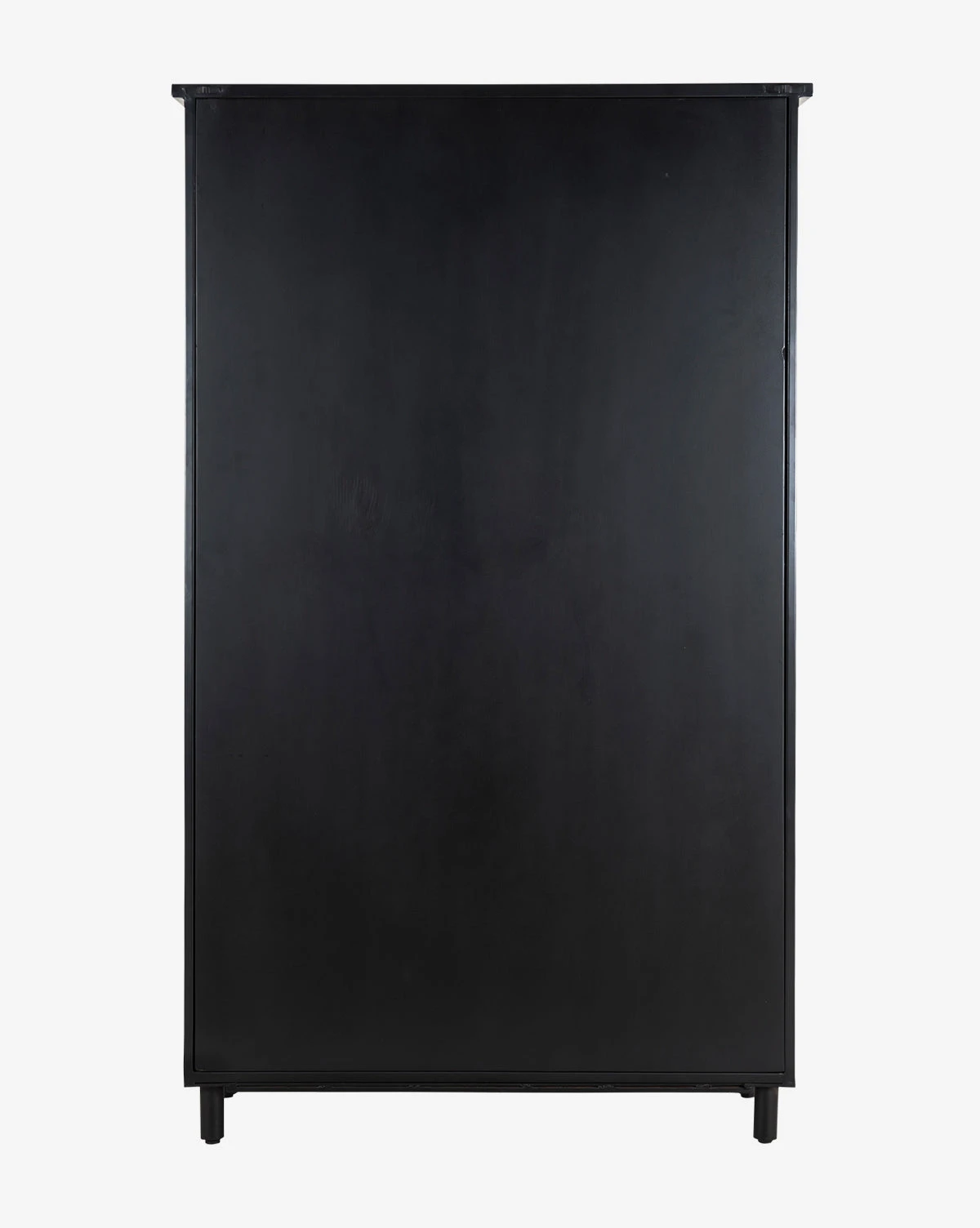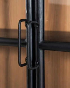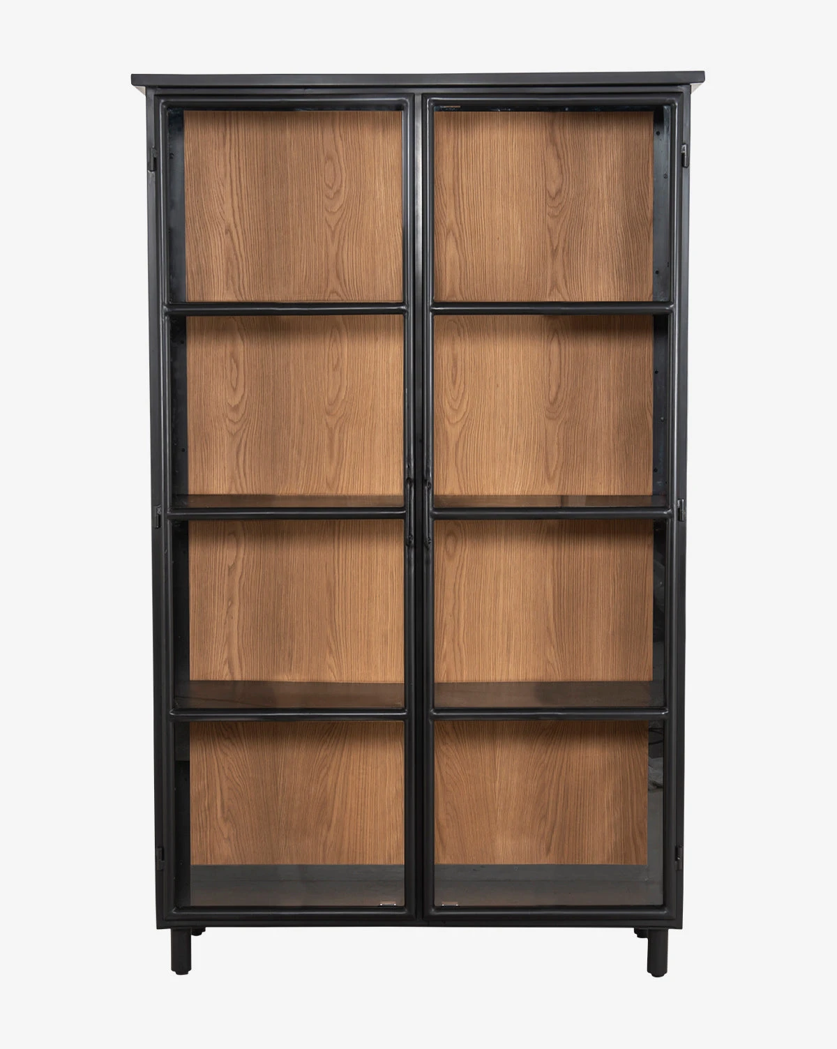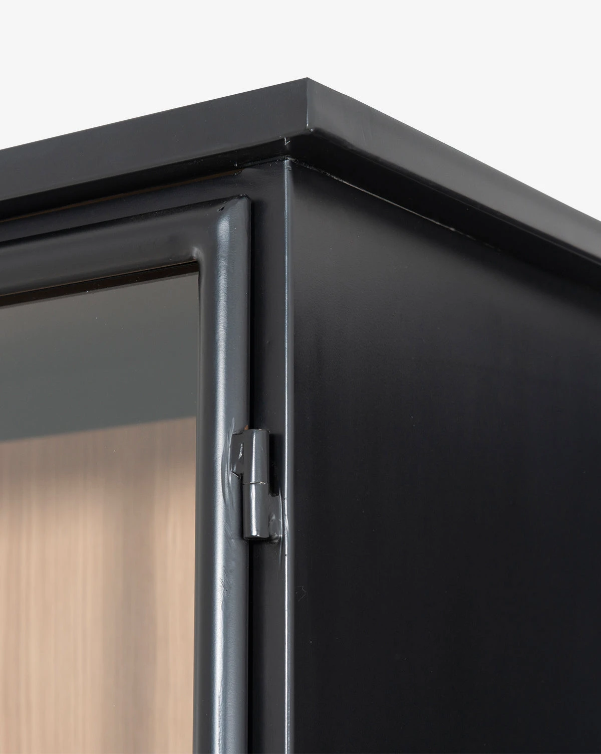 Dynamically designed, the Classen Cabinet has a sleek black finish on its iron frame that contrasts the natural oak backing. Tucked inside beautifully framed glass doors, the iron shelving is perfect for styling your treasured decor.
