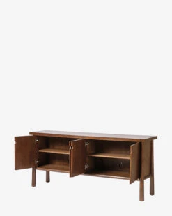 Crafted from oak, the Clemons Sideboard is a contemporary piece that makes a subtle statement with its unique design. With a dark toasted finish, tapered legs, and round cutouts in place of hardware, the intentional details of this sideboard bring sophistication to your space.