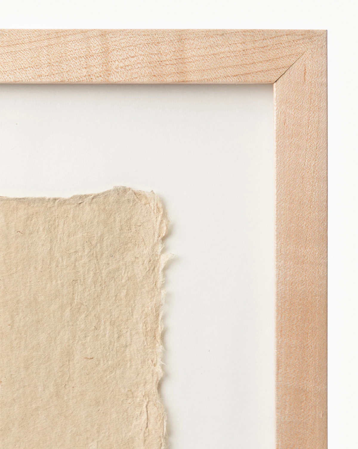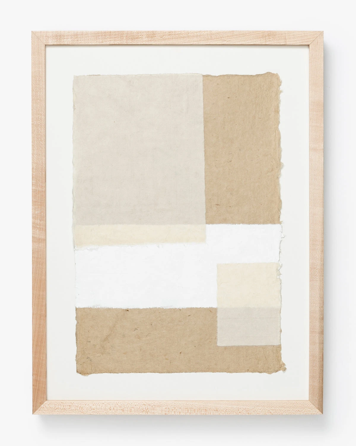 Neutral and textural, Collage 1 is a study in composition. Its simple palette allows the texture of the handmade paper to shine, while highlighting the creativity of the piece. Presented within a maple wood frame with an oak finish, this piece brings a uniquely dimensional feel to vignettes or wall treatments.