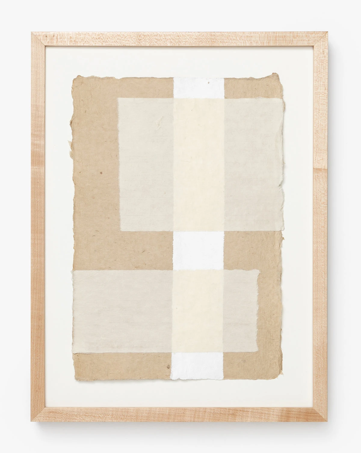 Neutral and textural, Collage 2 is a study in composition. Its simple palette allows the texture of the handmade paper to shine, while highlighting the creativity of the piece. Presented within a maple wood frame with an oak finish, this piece brings a uniquely dimensional feel to vignettes or wall treatments.