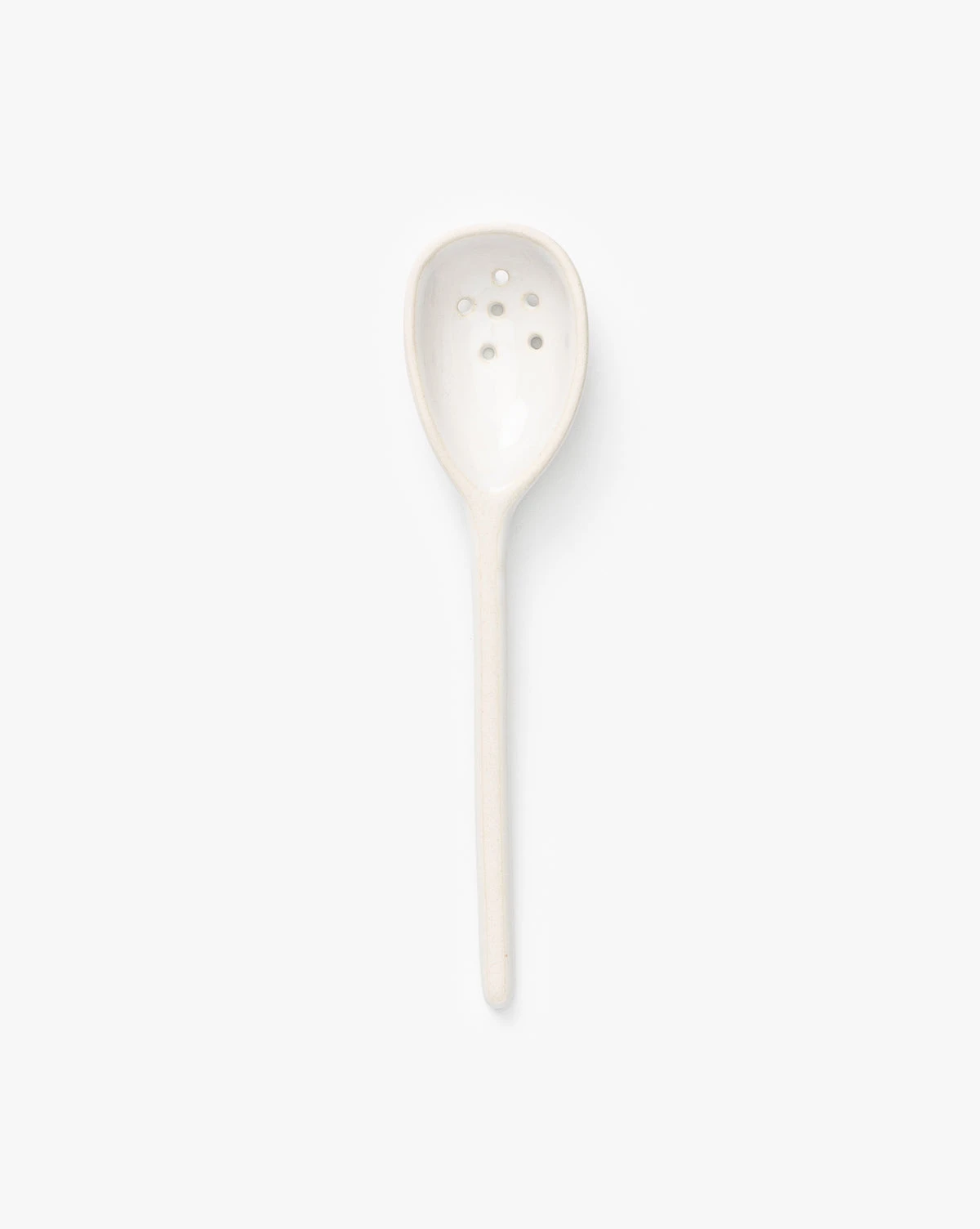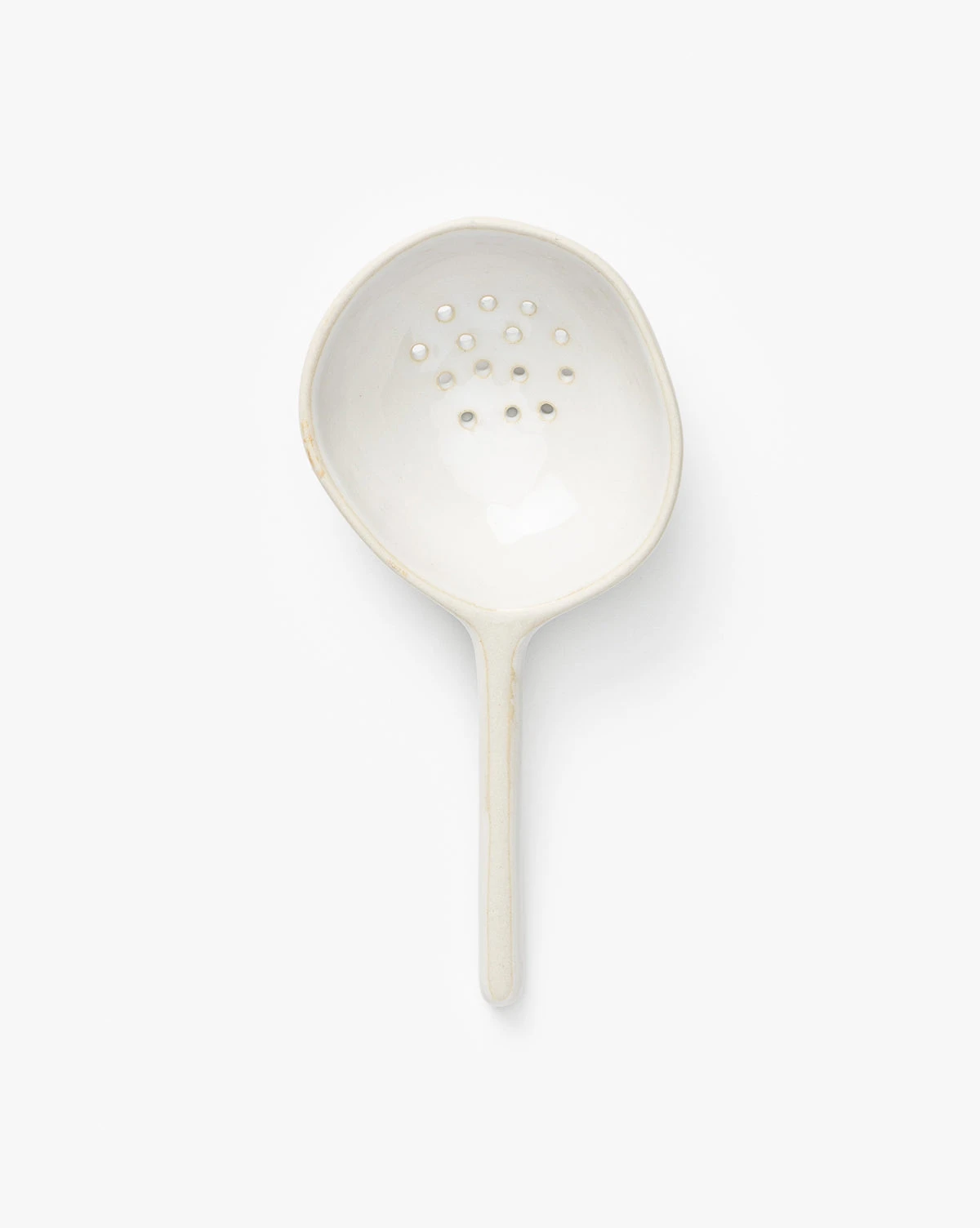 The Cream Stoneware Strainer Spoon brings life to your cookware with glazed detail and the character of handcrafted ceramics. Add this spoon to both a serveware collection and kitchen aesthetic as an inviting detail.
