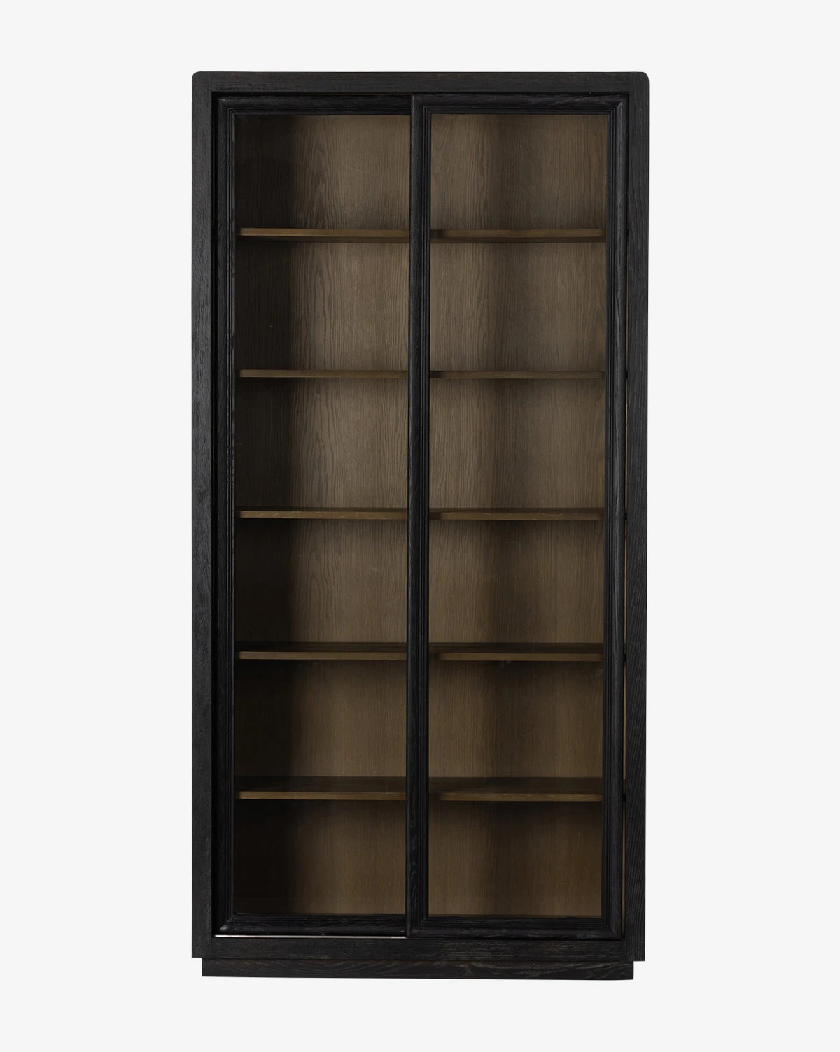 Made of distressed black oak, the Cristina Cabinet is sleek in its style and dramatic in its scale. The natural details of the oak bring detail to the dark cabinet while sliding tempered glass doors enclose generous interior shelving.