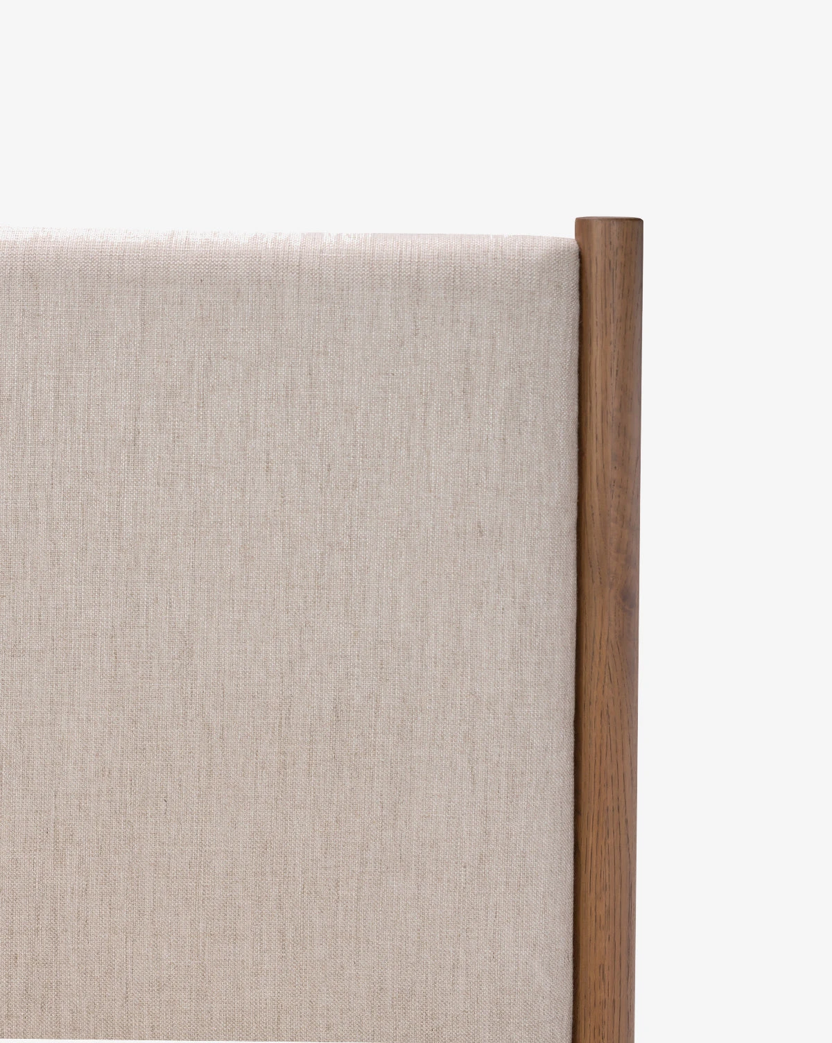 Crafted from a stunning mix of materials, the Crue Bed brings modern design to the forefront of your bedroom. Its oak frame features an amber finish that brings a complementary feel to the natural upholstered headboard.
