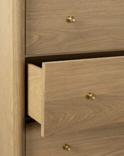 With natural detail and an elegant presence, the compelling Dana Tallboy Dresser elevates your space with its thoughtful details. Made from heritage white oak, the dresser holds five drawers finished with brass hardware.