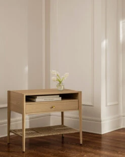 From its open shelving to its soft close drawer, the Dana White Oak Nightstand is all about the details. Crafted from white oak, this elevated but casual nightstand is finished with brass hardware and an endearing woven seagrass shelf.