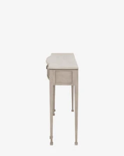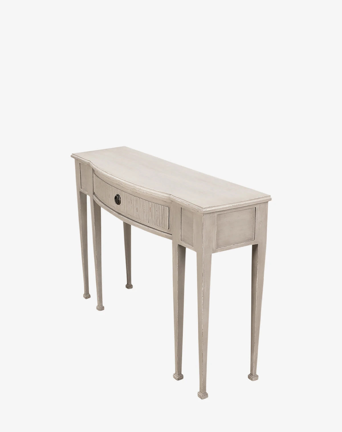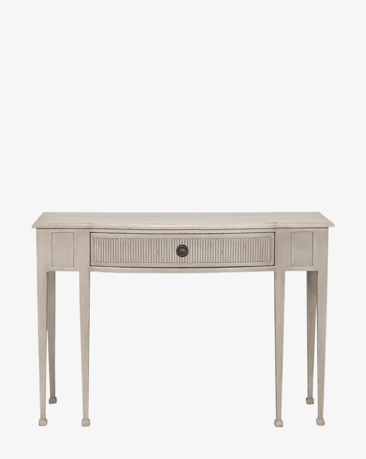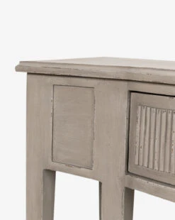 Featuring subtle reeded detail on the front of the center drawer, the Dathan Console Table brings a touch of modern design to a classic form. Its gray traditional finish complements the beechwood construction, highlighting the organic detail yet maintaining a refined feel.