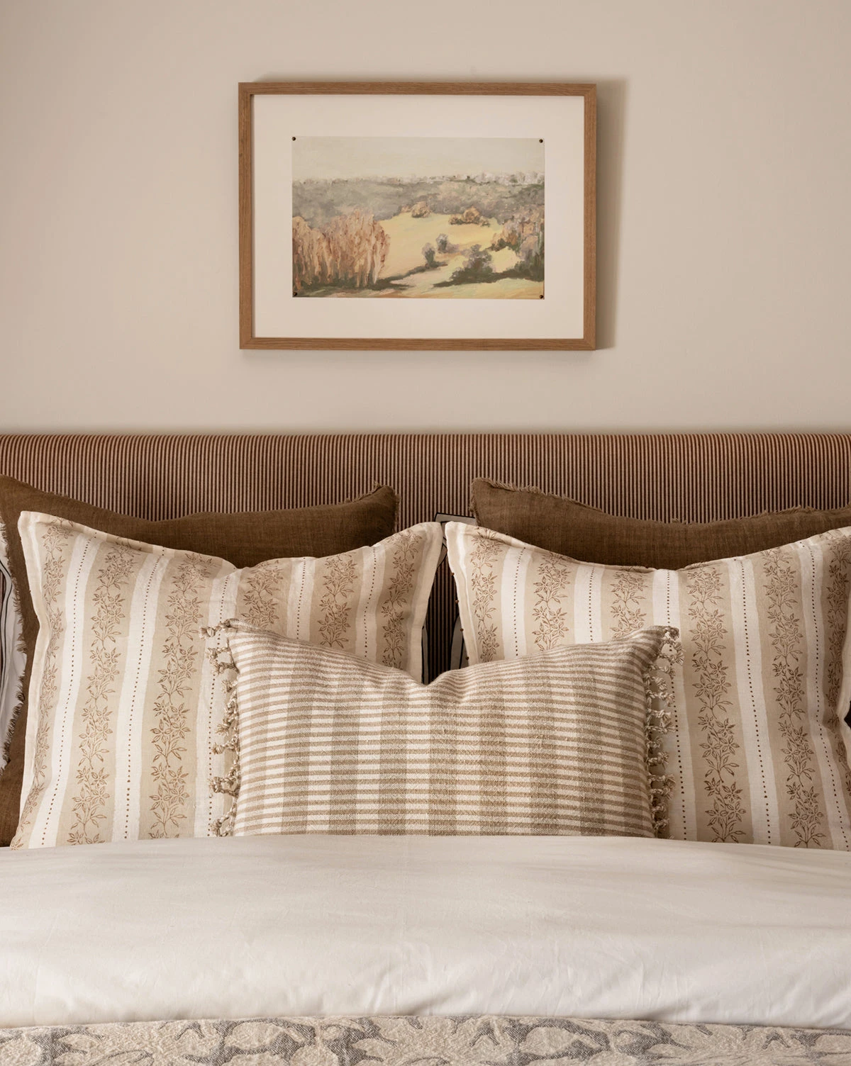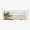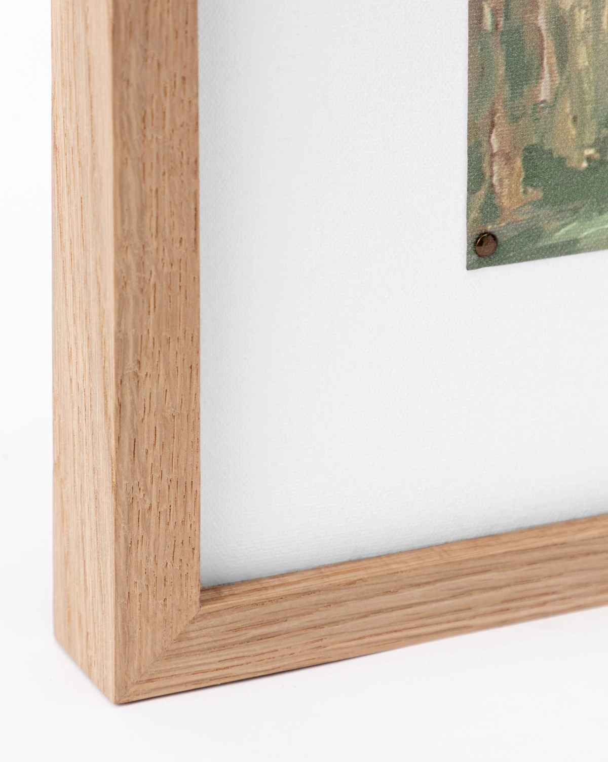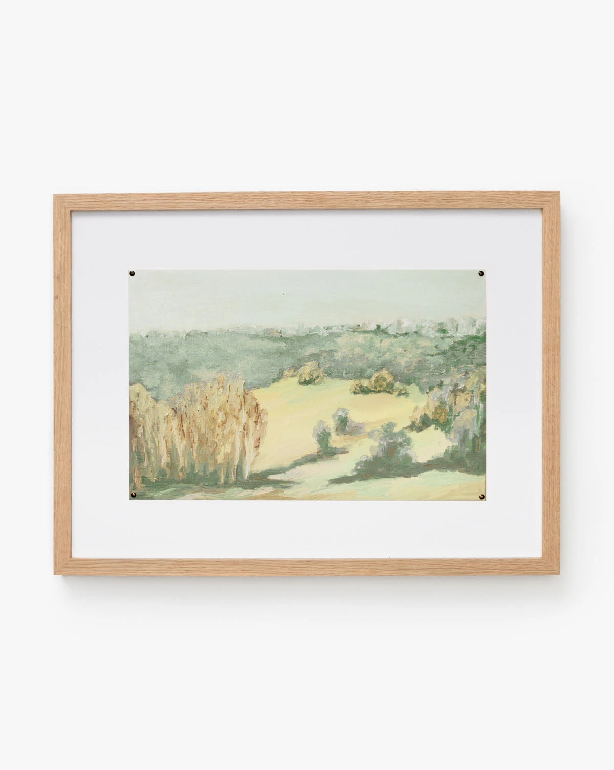 A serene pastel landscape, Dawn Skyline uses expressive brush strokes to tell its story. A wood frame with a white oak finish allows for versatile styling in your home, elevating wall treatments or dresser vignettes.