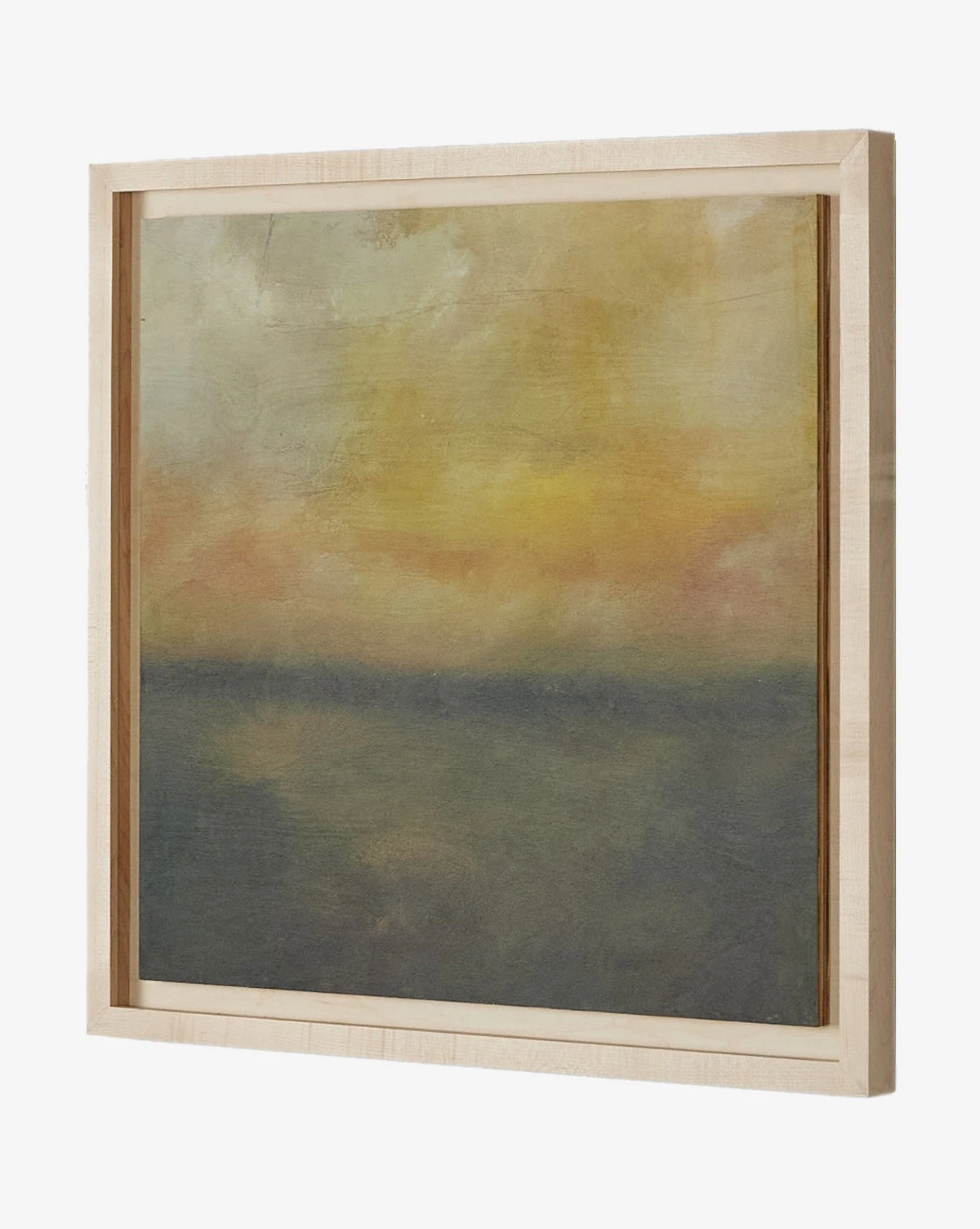 Evoking the feeling of a warm sunset, Dawning plays with a beautiful juxtaposition of light and dark. Presented within a natural maple frame, the piece by artist Melanie Biehle brings a moment of serenity wherever it’s placed. Â
