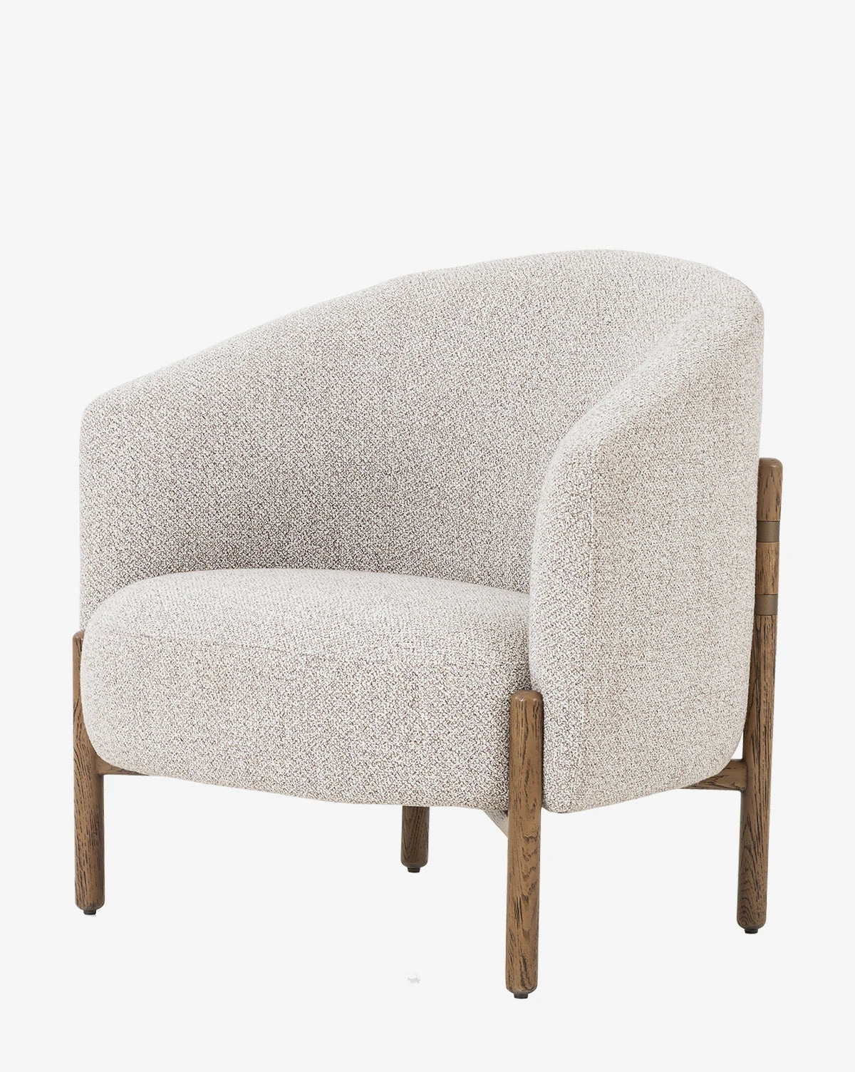 Modern and elegant, the traditional barrel back seat gets an update with a subtle wing silhouette and solid oak framing. Upholstered in a light stone performance fabric or a palermo cognac, this chair is finished with rear iron stretchers adding a thoughtful, contemporary touch.