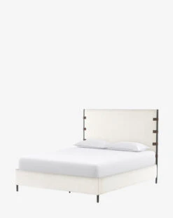 Engaging the senses with a material-rich design, the Depolo Bed blends a cream boucle with rich brown leather straps and strong metal rods. Its high-end craftsmanship gives your bedroom a comfortable feel, adding a bold and intentional quality to the space.