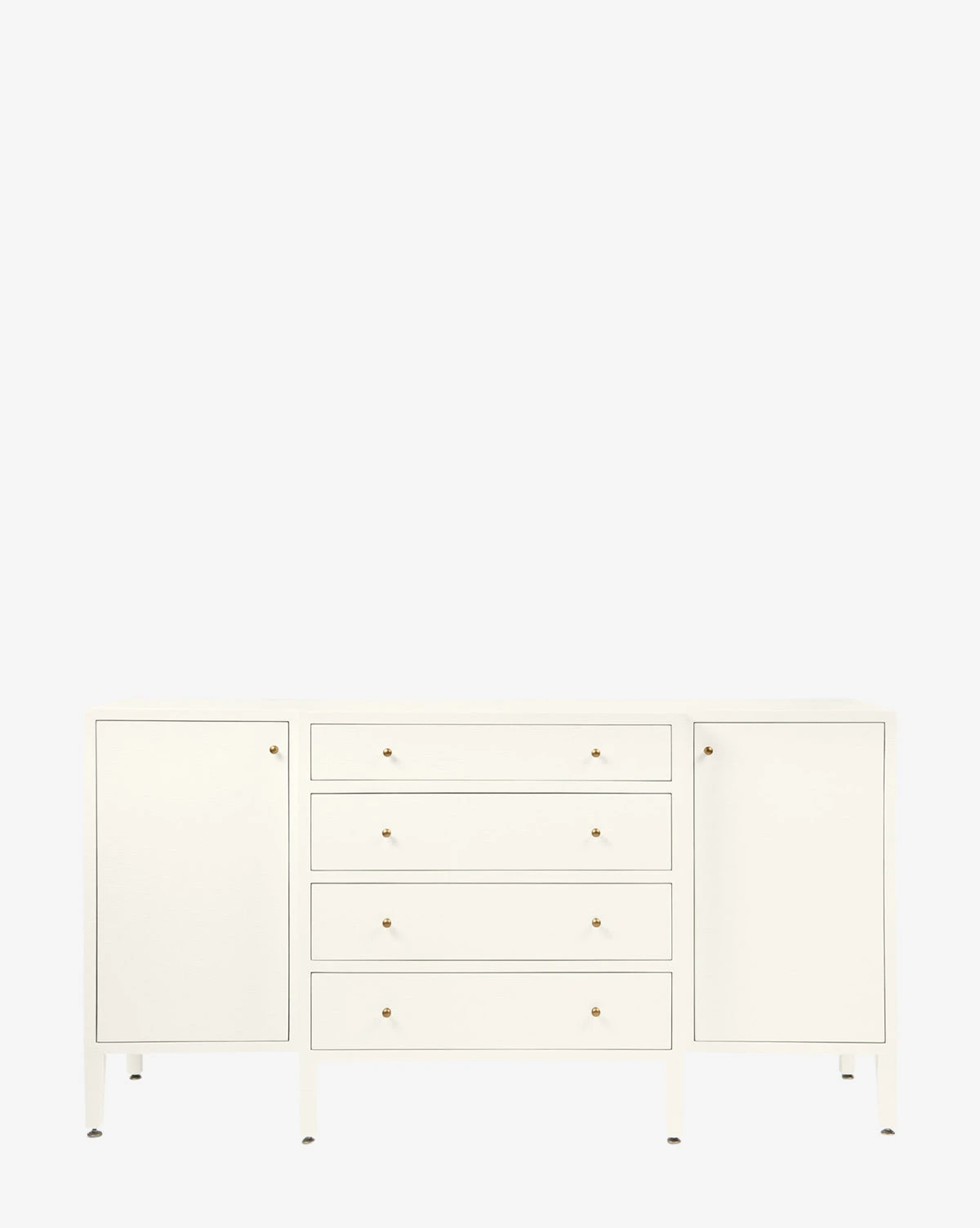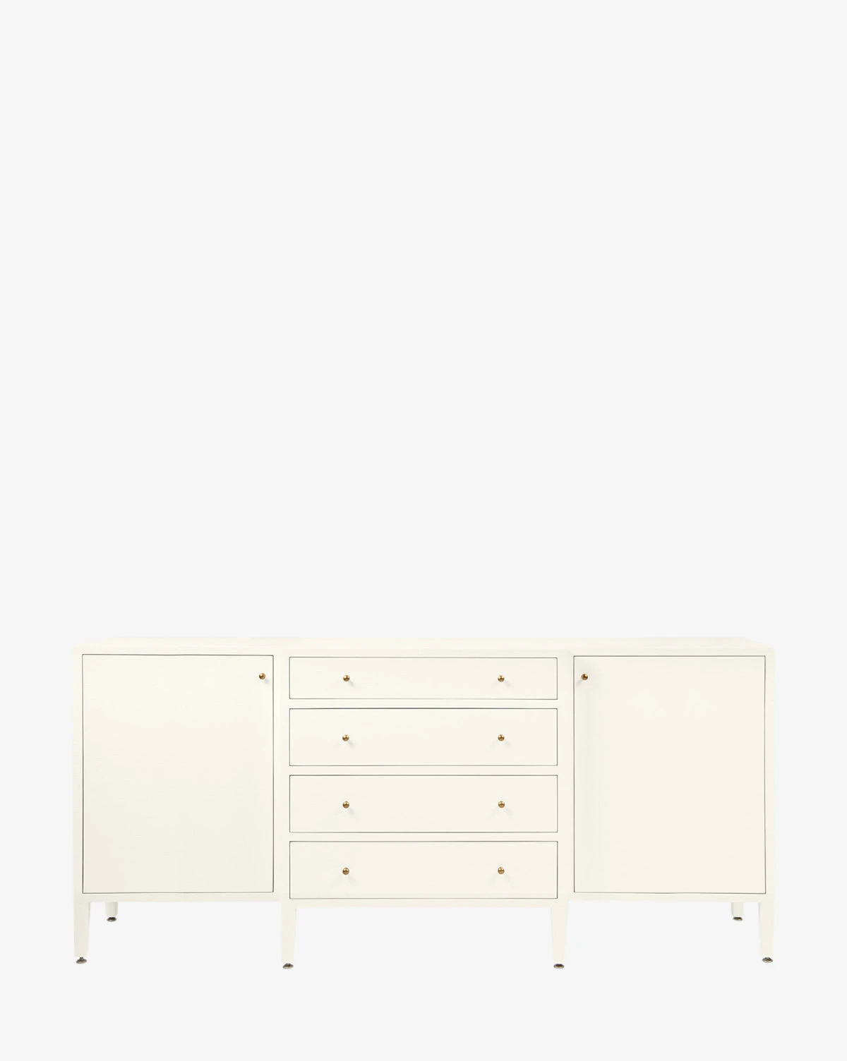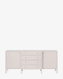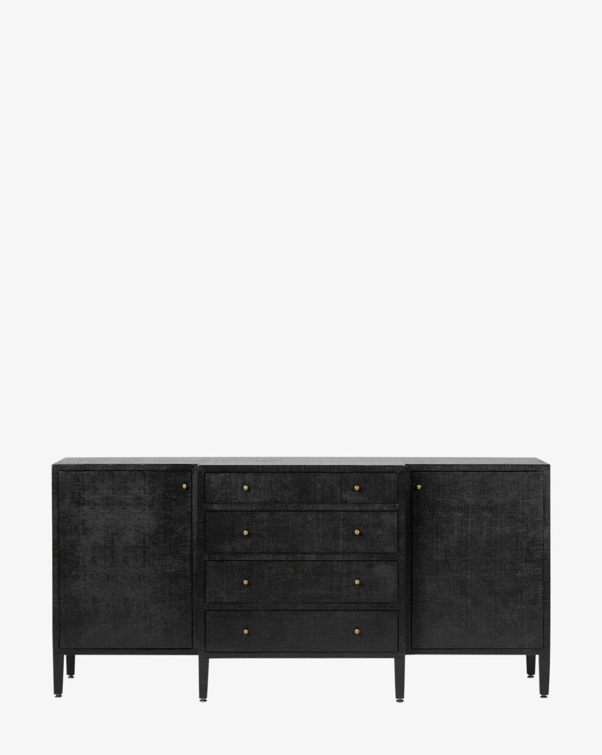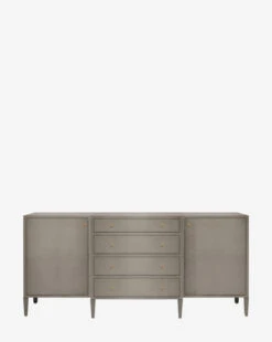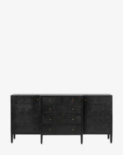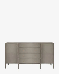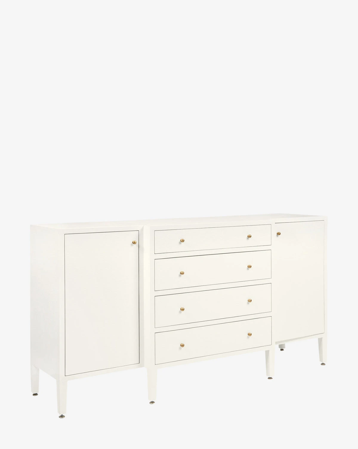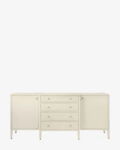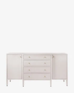 Made from a structure covered in white hand-stamped faux raffia, the Donnellson Buffet is classic and dimensional. With deep drawers and a door on each end complemented by simple brass hardware, the buffet is as elegant as it is functional.