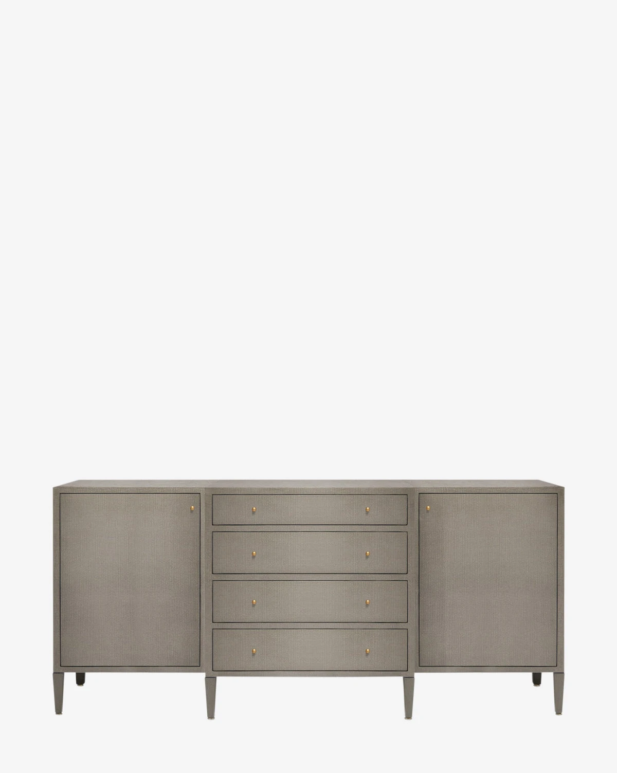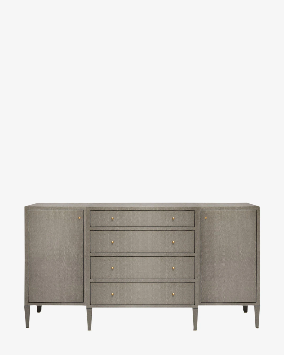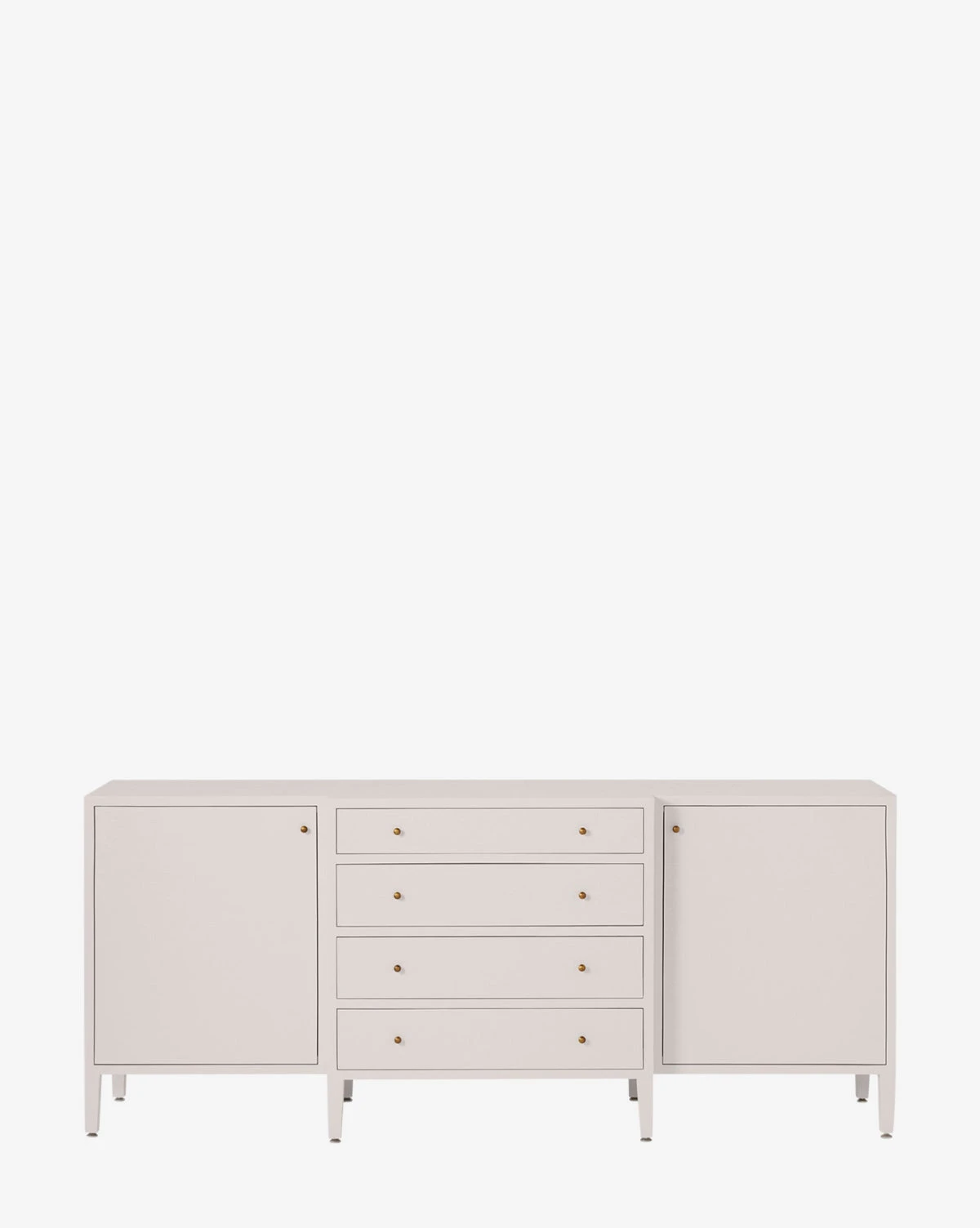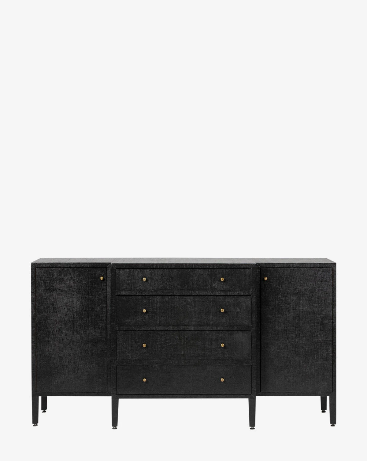 Made from a structure covered in white hand-stamped faux raffia, the Donnellson Buffet is classic and dimensional. With deep drawers and a door on each end complemented by simple brass hardware, the buffet is as elegant as it is functional.