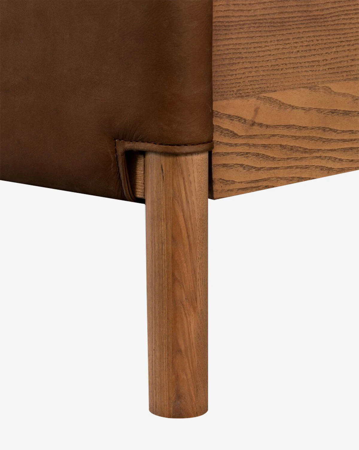 Made from a stunning mix of materials, the Dorian Bed brings tone and texture to the center of your bedroom styling. Its frame features top grain leather upholstery for a warm and sophisticated feel. Â