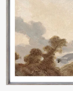 Subdued and rich, Dusk is painted in a tone-on-tone palette with a soft touch of blue. Its casual brush strokes are intentional and faded, illuminating the scene of dusky mountains with a sense of mist and crisp air. The clouds and trees gently move the viewer through the piece with casual direction, adding a sense of calm to galleries and vignettes. Â