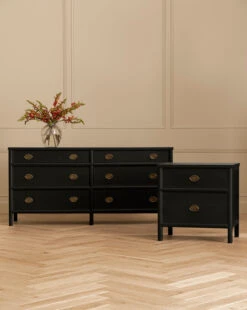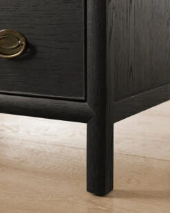 Introduce refined sophistication to your bedroom with the Edward Dresser in Black Ash finish. Featuring clean lines, spacious drawers, and timeless brass hardware, it offers both style and ample storage. Perfect for creating a polished, collected look that feels effortlessly elevated and enduring.