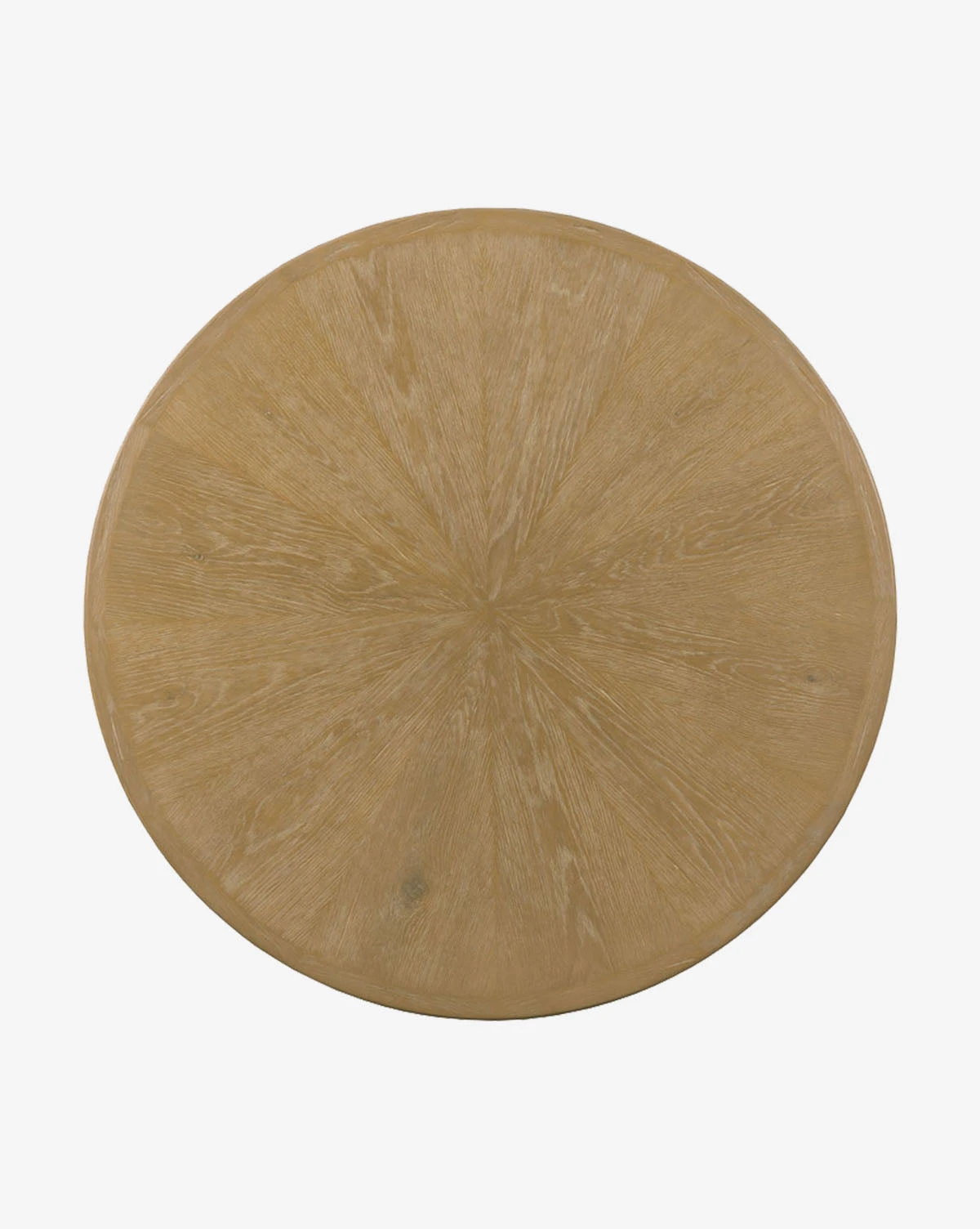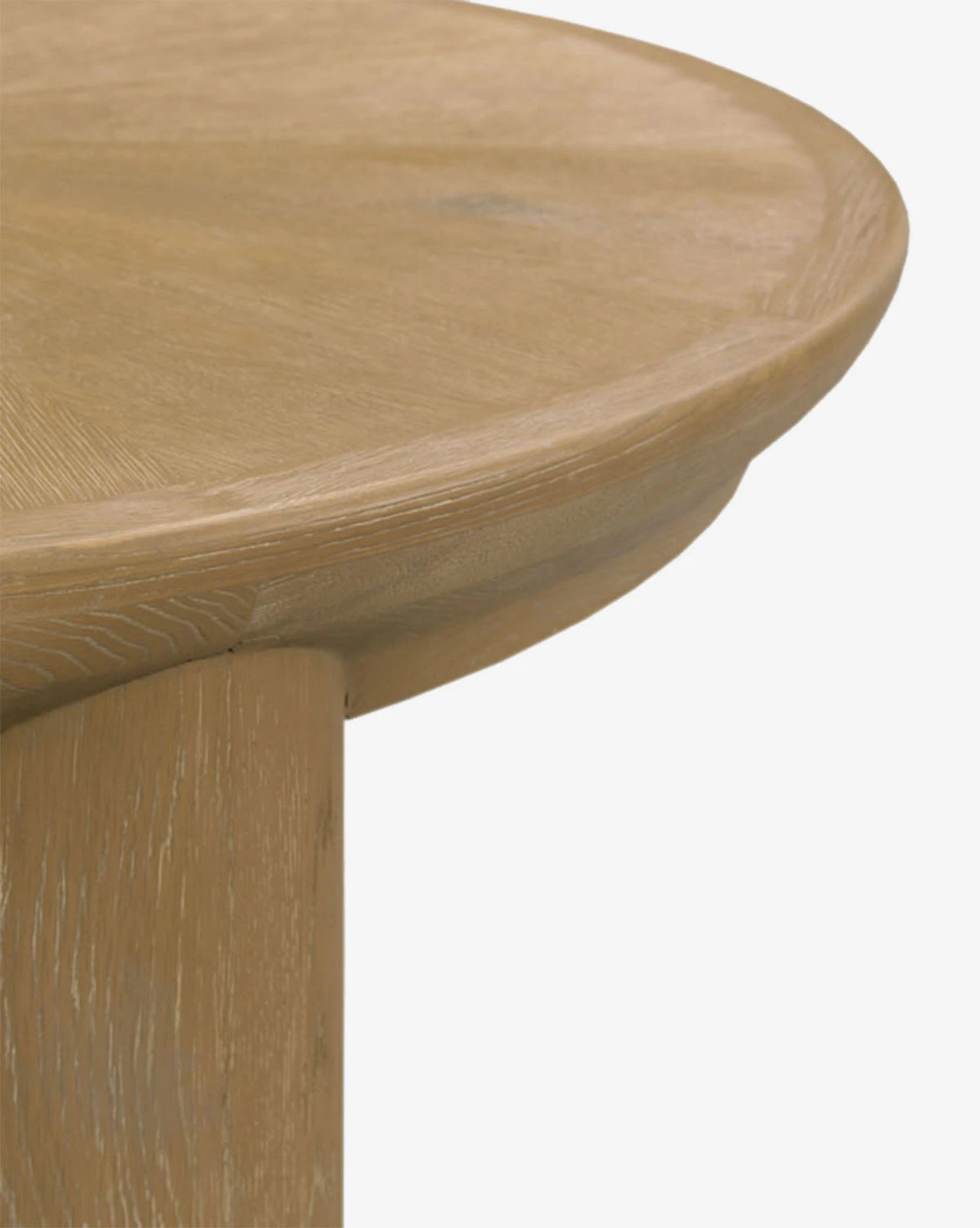 In a limewash finish, the Edwina Coffee Table boasts a creative, contemporary design. Its thick round structure adds shape and dimension to your space. Made from solid oak and oak veneer, the natural details of the coffee table make for the perfect mix of organic and modern.