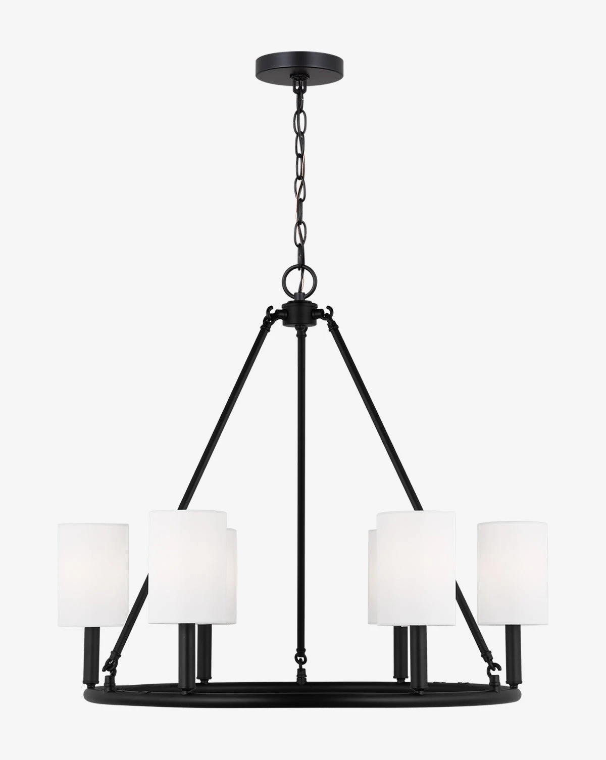 The Egmont Chandelier is inspired by the traditional chandelier but given a modern update. Sleek lines and an open frame holding white linen shades make for a beautiful accent for the entryway, dining, or kitchen area.