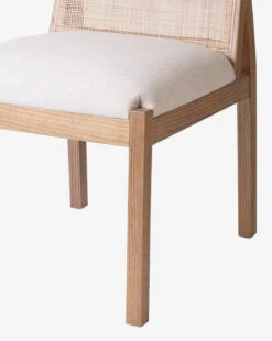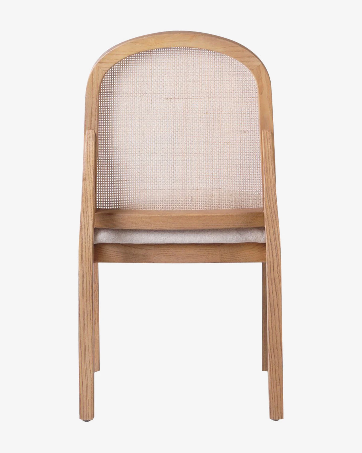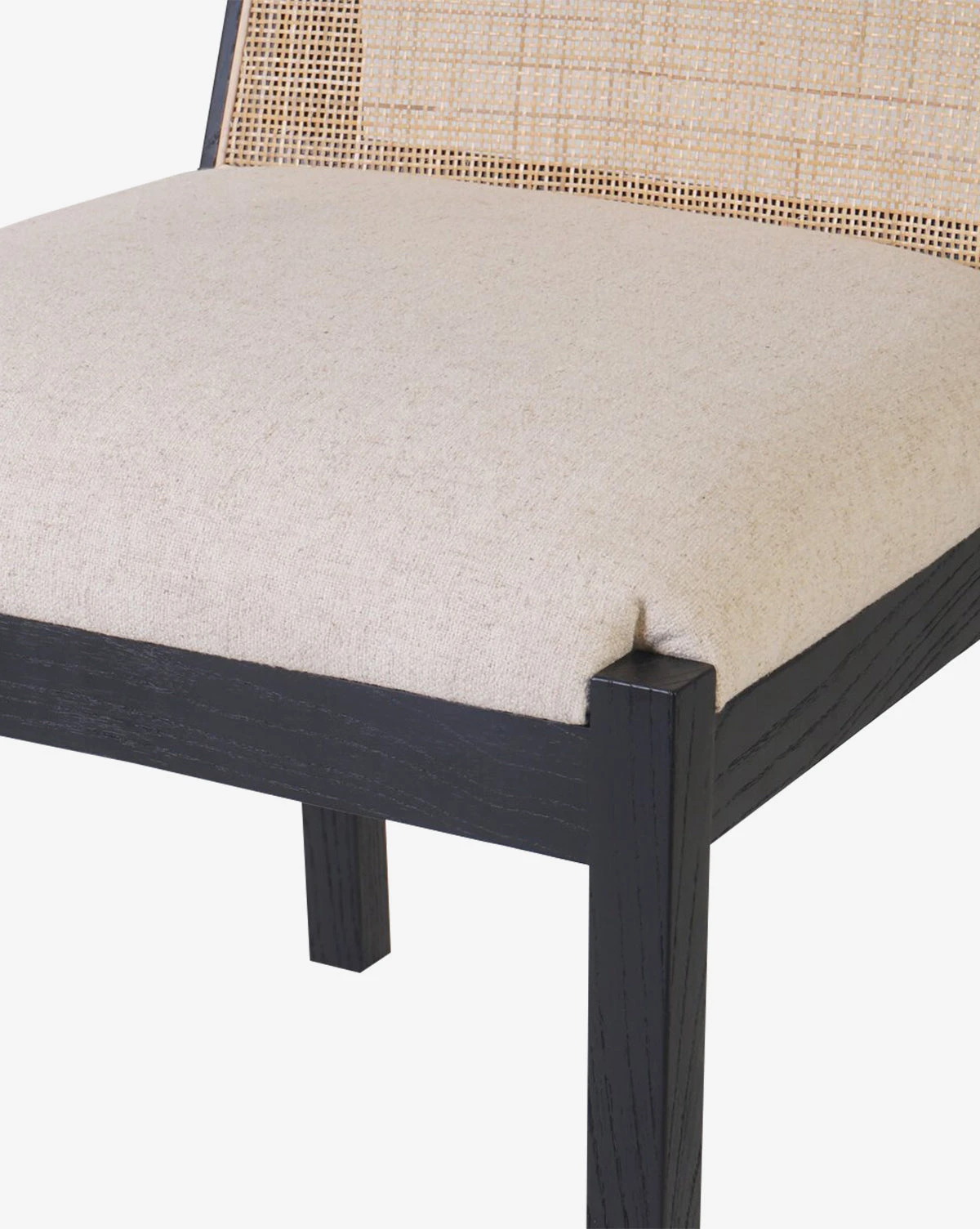 A straightforward design and natural tones define the casual yet sophisticated Eira Dining Chair. Its performance fabric seat is complemented by a crosshatch cane seat back, bringing a seamless mix of materials to your dining room. Â