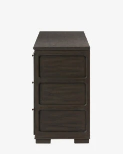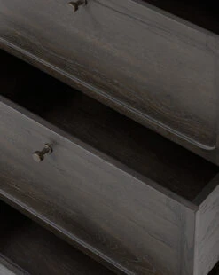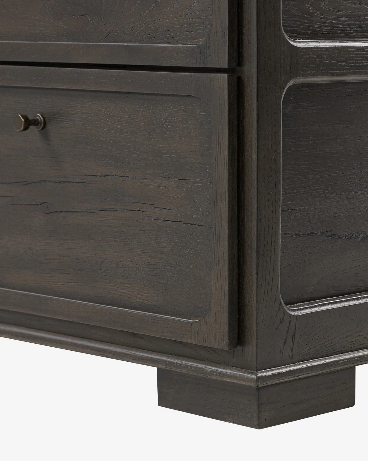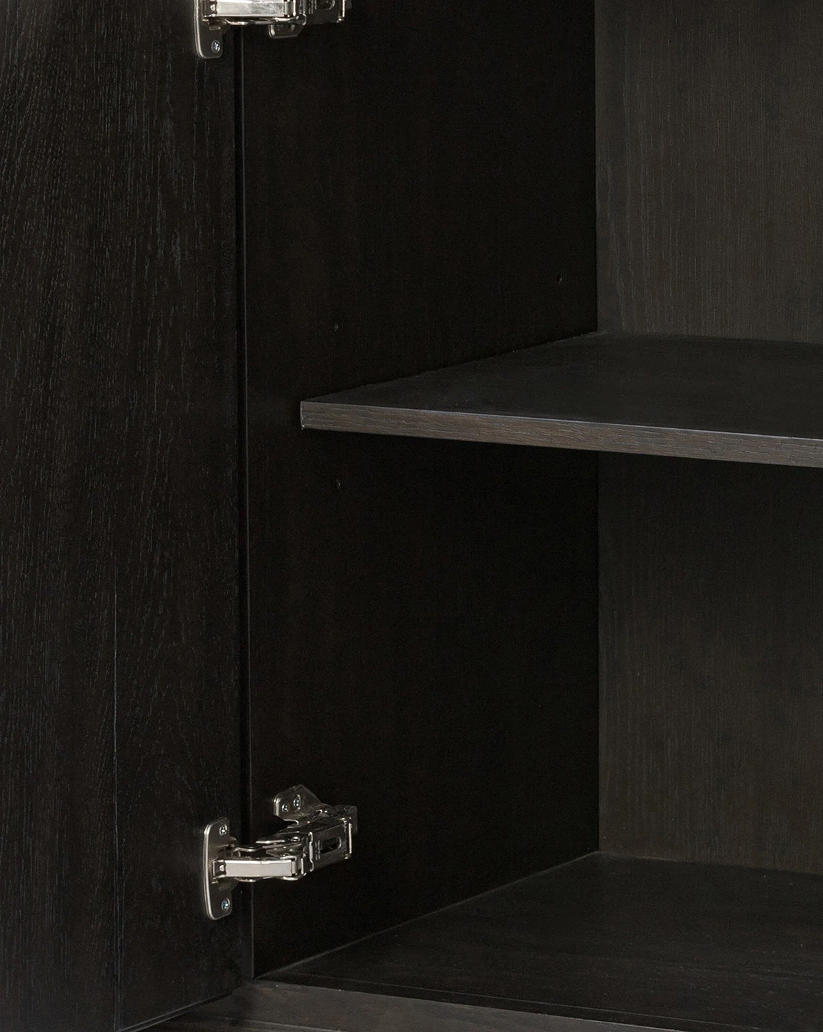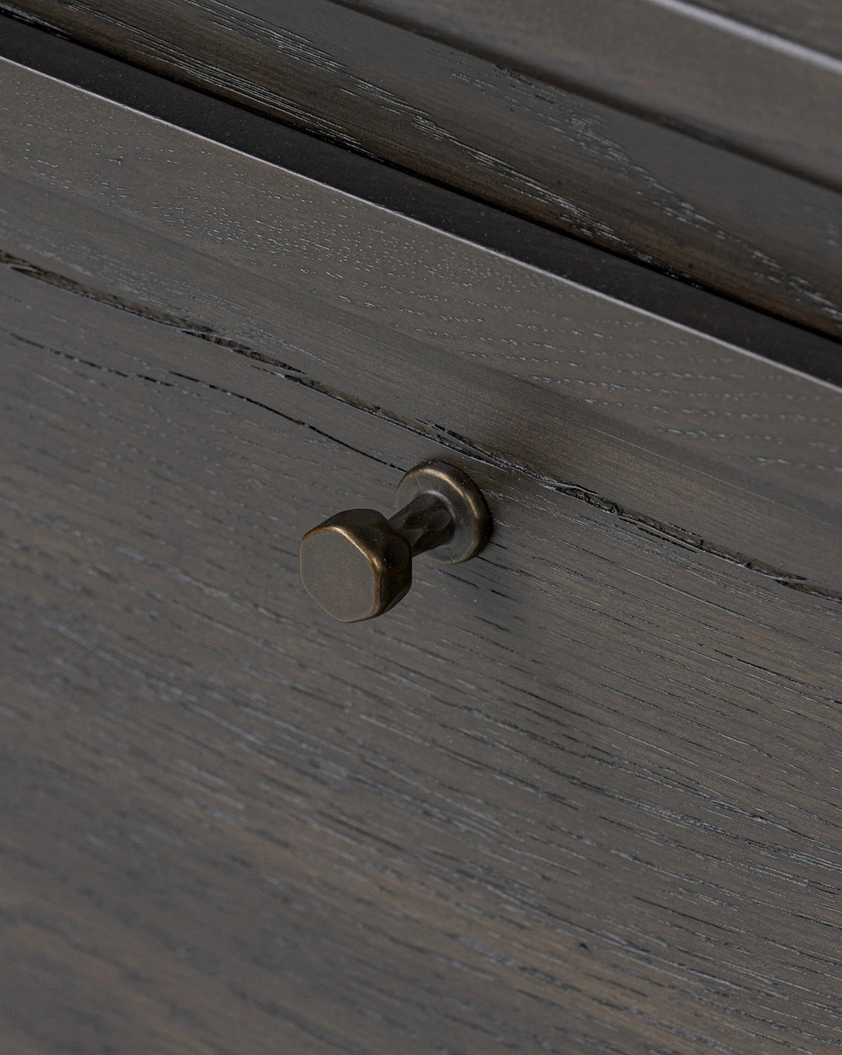 Modern Deco style meets timeless tradition in the Eldoria Oak Sideboard. Finished in rich black oak with warm brown undertones that highlight the natural grain, it features three drawers on each side with rounded molding and hammered hardware. A bold, refined piece that balances sculptural detail with everyday function.