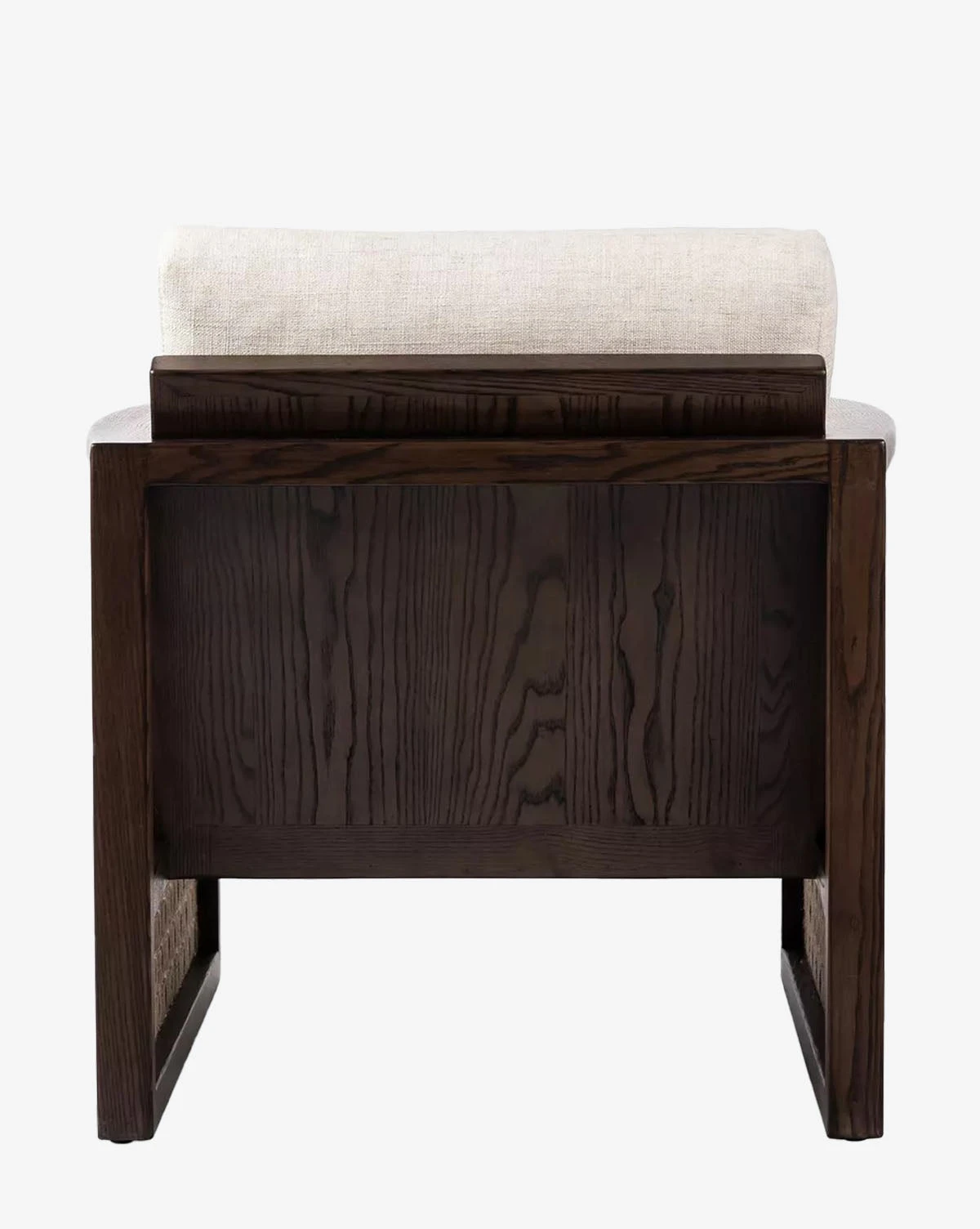 Comfortable and timeless, the Elspeth Lounge Chair is crafted with ash wood in a rich brown finish, featuring woven jute side panels. Its intricately detailed frame holds plush upholstered cushions in a cream tone.