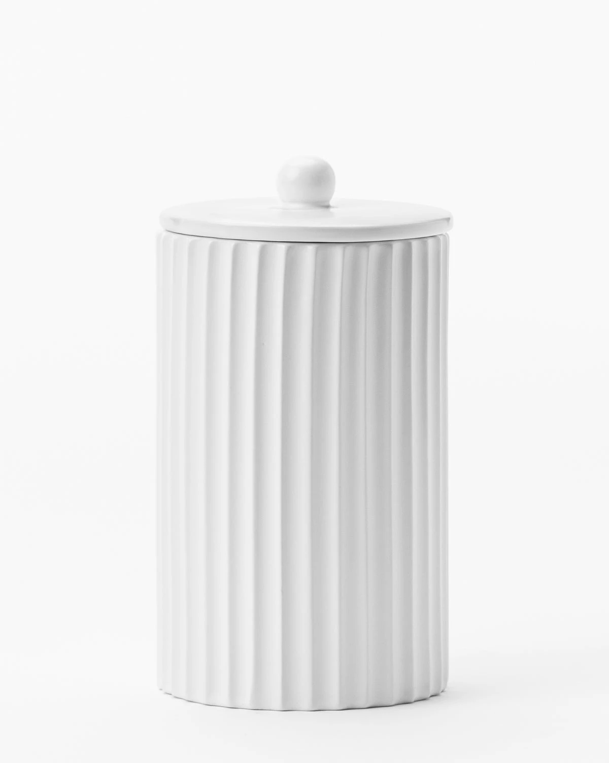 Fluted edges give texture and detail to the simple, clean Fluted Lidded Bathroom Canister. Crafted from ceramic in a smooth white finish, this canister is topped with a straightforward lid designed with a subtle knob handle. Bringing organization and delicate detail to the bathroom, the Fluted Lidded Bathroom Canister is an essential bathroom accessory.