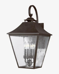 In a sable finish, the Galena Outdoor Lantern borrows from traditional design to create a fixture that will last. With a classic lantern shape held by a curved arm and a backplate, this piece is filled with a candelabra displayed behind clear seeded glass.
