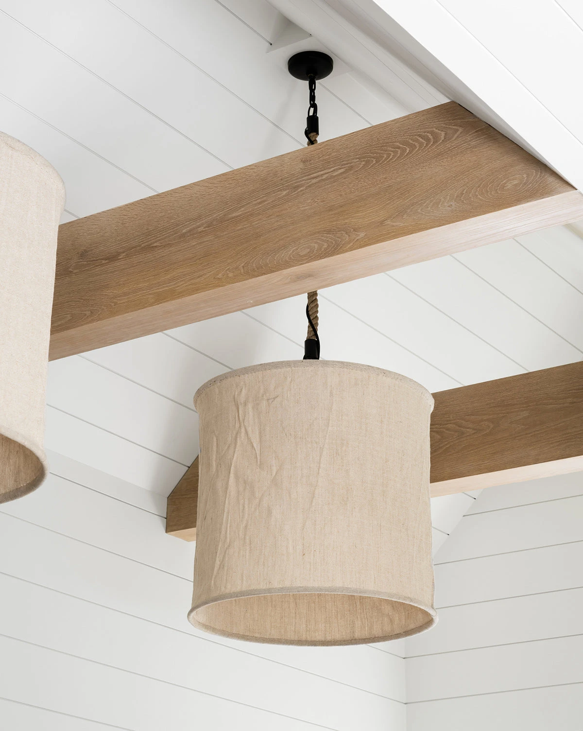 Suspended from a thick, textural rope, our Gallen Pendant provides an unexpected element to your home lighting. Its sturdy iron frame is covered in linen for a soft, relaxed look while simple black hardware finishes off the design.