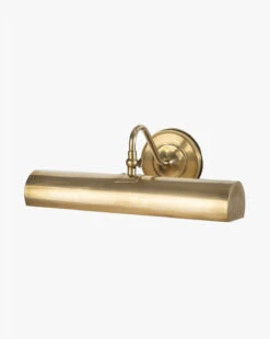 In either a burnished bronze or antique brass finish, the Gallery Picture Sconce is intricate and classic. Its elongated metal shade is connected to a round backplate with a sleek bent arm, bringing a vintage-inspired look to your space.