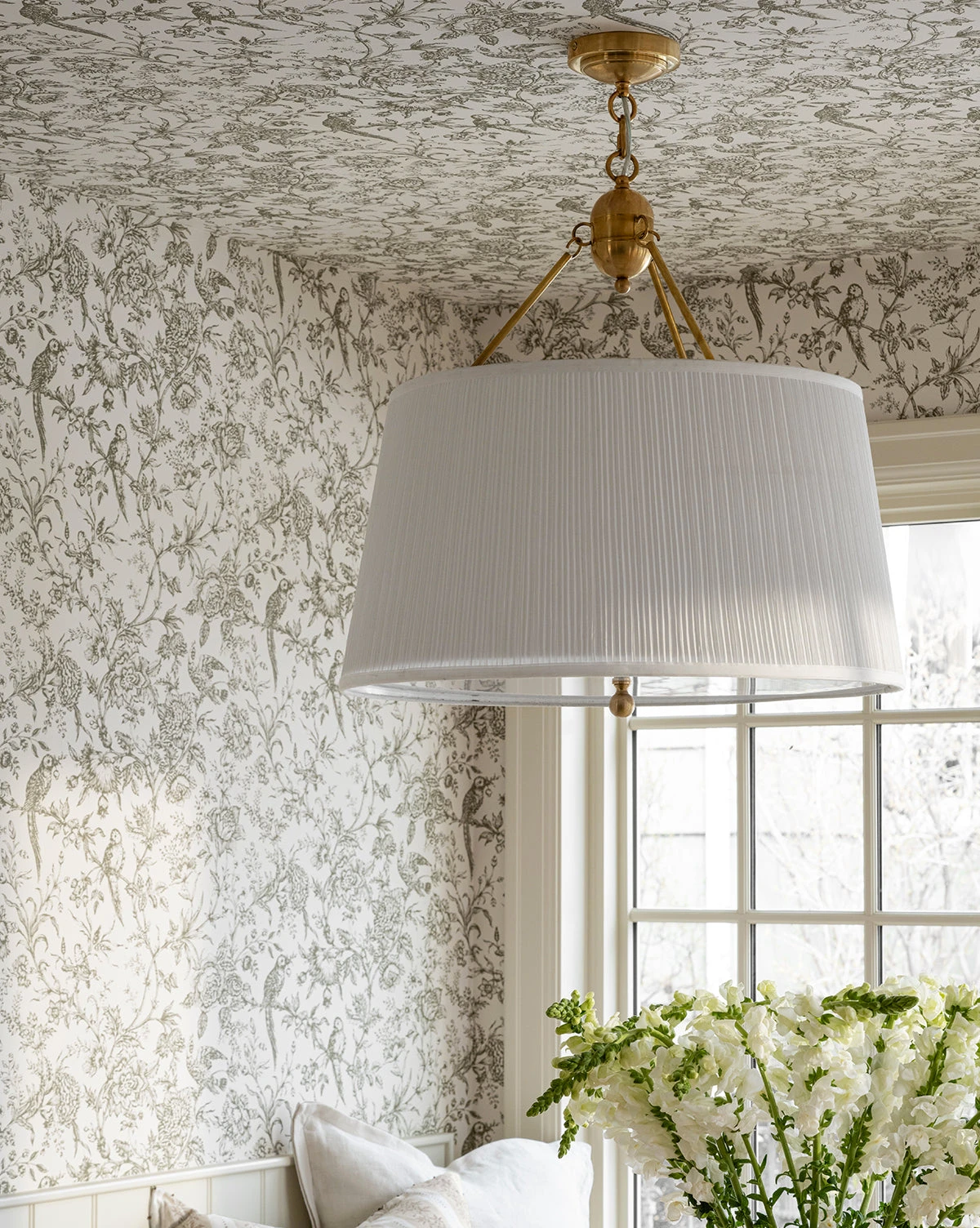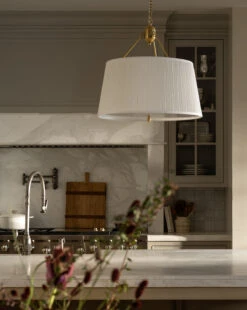 Sophisticated in design, the Georgiana Pendant makes its presence known in both modern and traditional spaces with its distinctive details. Featuring a linen pleated shade, the antique brass finish on its structure provides a welcome contrast. Â