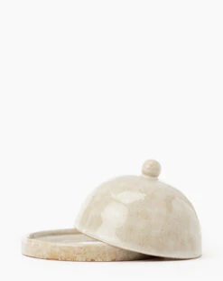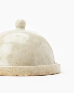 This Glazed Stoneware Cloche has an organic touch given by its glazed finish with earthy undertones. Its deliberate imperfection lends a handmade feel, making it a warm addition to countertops and kitchen spaces.