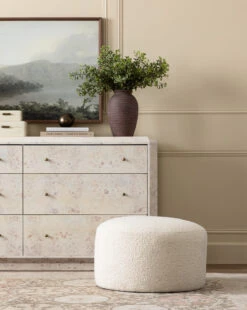 In a playfully round form, our Hemlock Upholstered Ottoman brings contemporary simplicity to your home wherever it is styled. We designed the ottoman to be as elegant as it is functional, with a cushioned top that is equally firm and comfortable. Customize this made-to-order piece with an array of high-quality fabric choices to elevate your space.